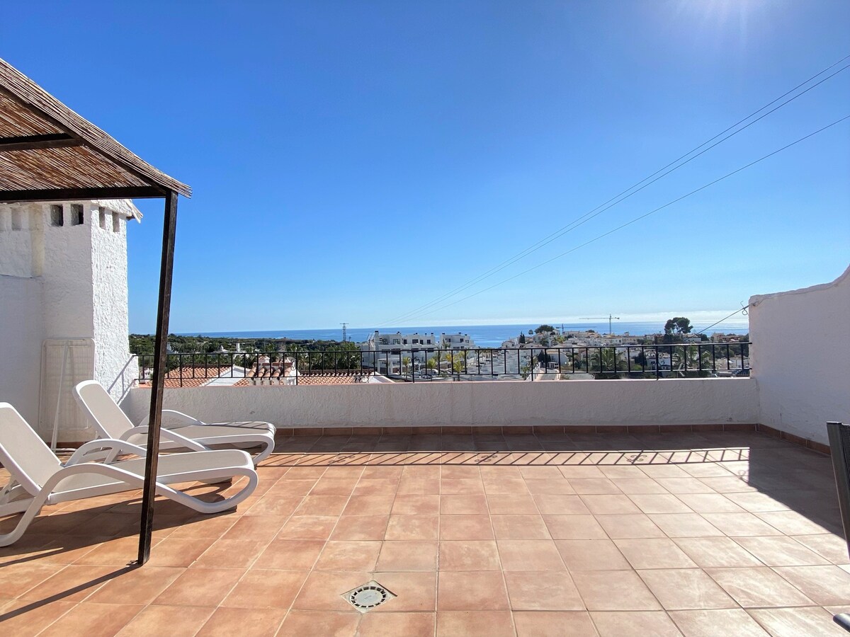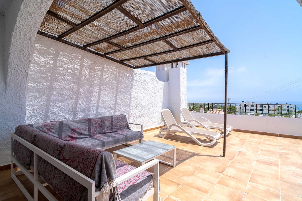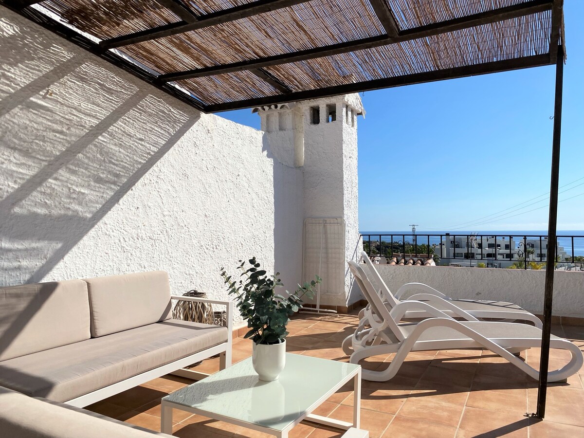 A stunning newly furnished, spacious 2 bedroom house within the complex of Capistrano Pueblo, with spectacular south facing sea views from a large sized 30 sq mt terrace. The house is located close to the entrance of the urbanisation and as a result close to one of the largest supermarkets in Nerja (Mercadona) and the communal swimming pool.The property comprises of 2 generous sized bedrooms, a bathroom, and open plan kitchen, dining area and living room. The south facing terrace is unusually large for a 2 bedroom property and offers sun throughout the day while also providing a partly covered shaded area with a comfortable corner sofa with coffee table. It also offers a gas barbeque, dining table with 4 chairs, and 2 sun loungers.