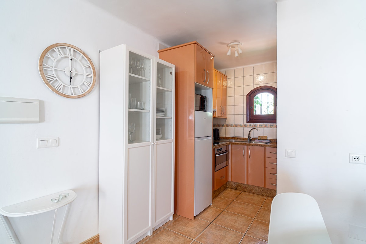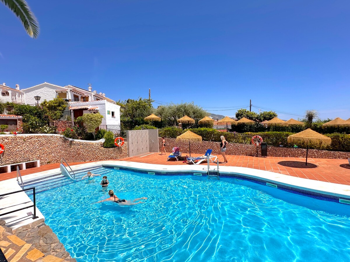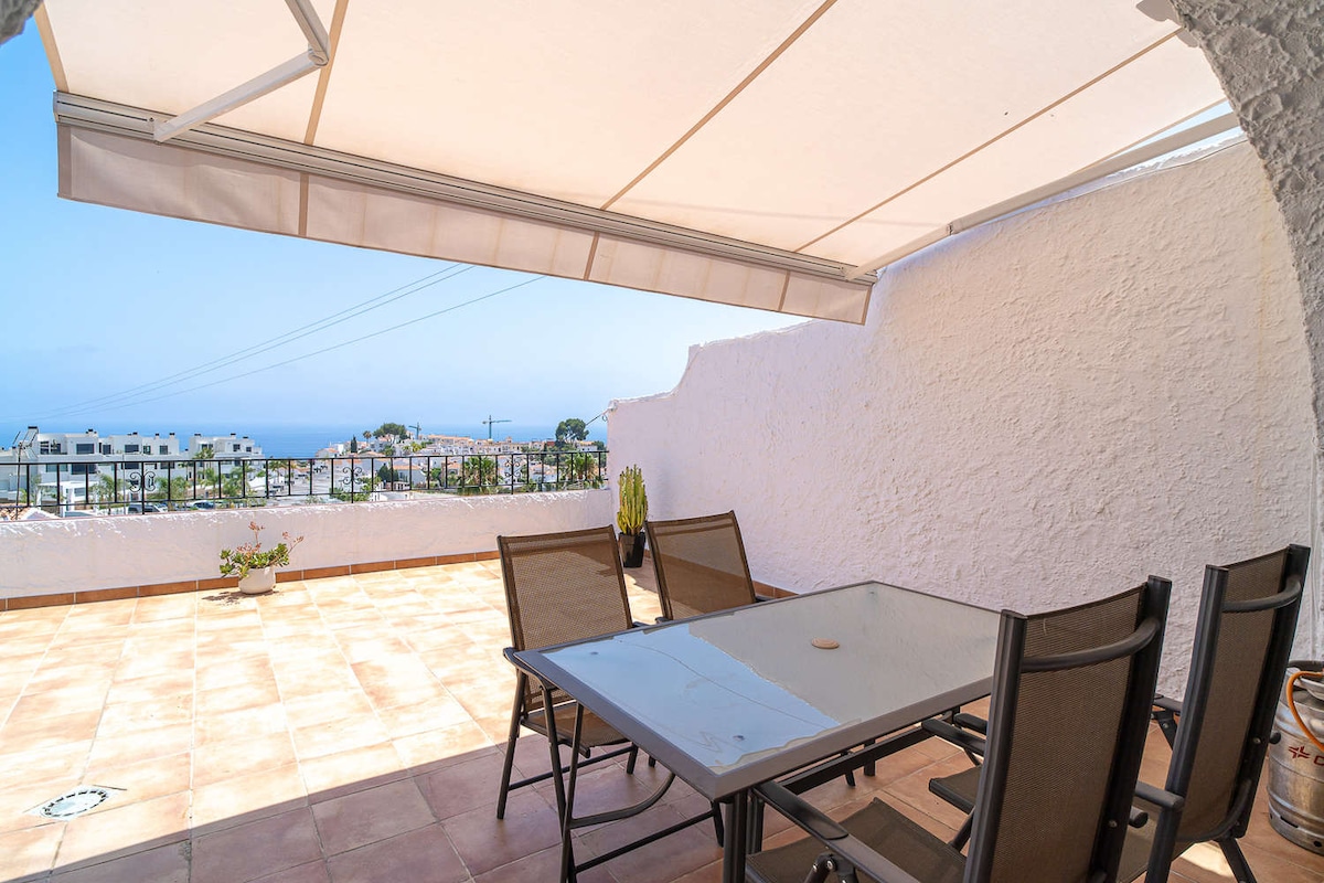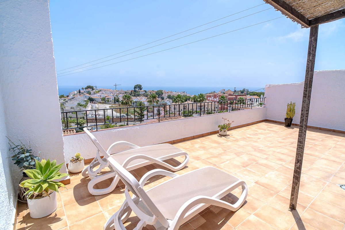 A stunning newly furnished, spacious 2 bedroom house within the complex of Capistrano Pueblo, with spectacular south facing sea views from a large sized 30 sq mt terrace. The house is located close to the entrance of the urbanisation and as a result close to one of the largest supermarkets in Nerja (Mercadona) and the communal swimming pool.The property comprises of 2 generous sized bedrooms, a bathroom, and open plan kitchen, dining area and living room. The south facing terrace is unusually large for a 2 bedroom property and offers sun throughout the day while also providing a partly covered shaded area with a comfortable corner sofa with coffee table. It also offers a gas barbeque, dining table with 4 chairs, and 2 sun loungers.