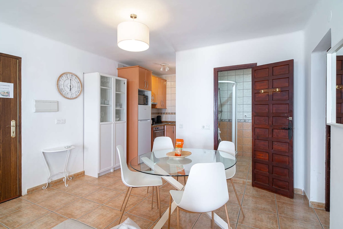 The kitchen is small yet well equipped with oven, hob, fridge freezer, kettle, toaster, coffee machine, microwave. It is an open plan kitchen adjoining to the dining area space which offers a modern round, glass dining room table with 4 chairs.