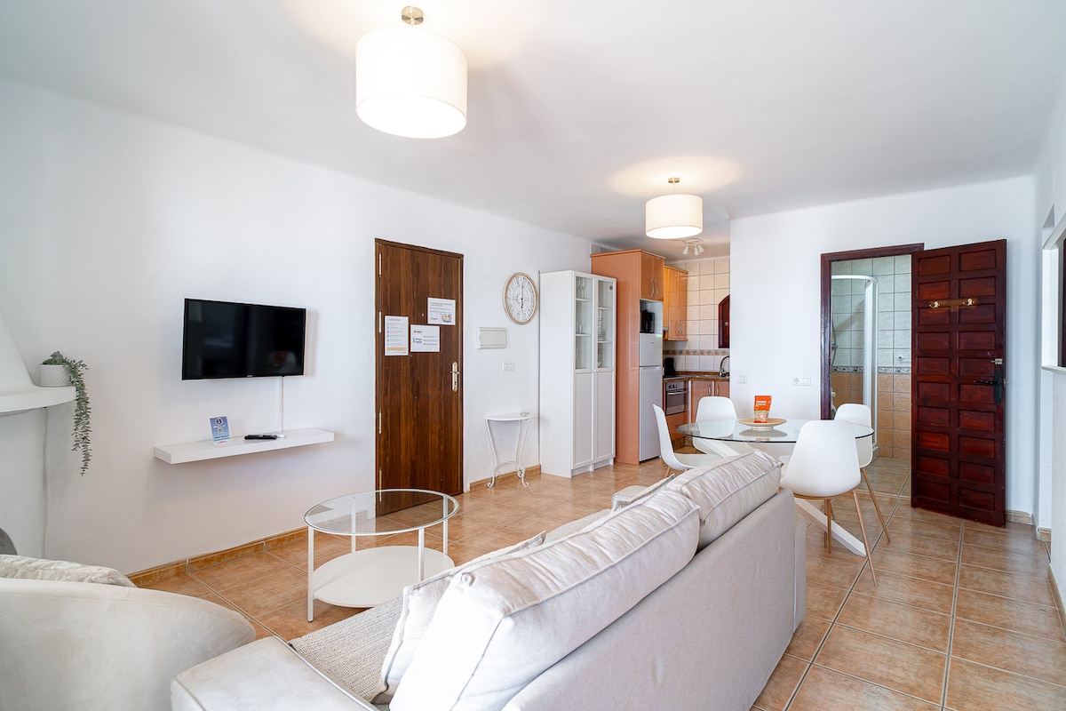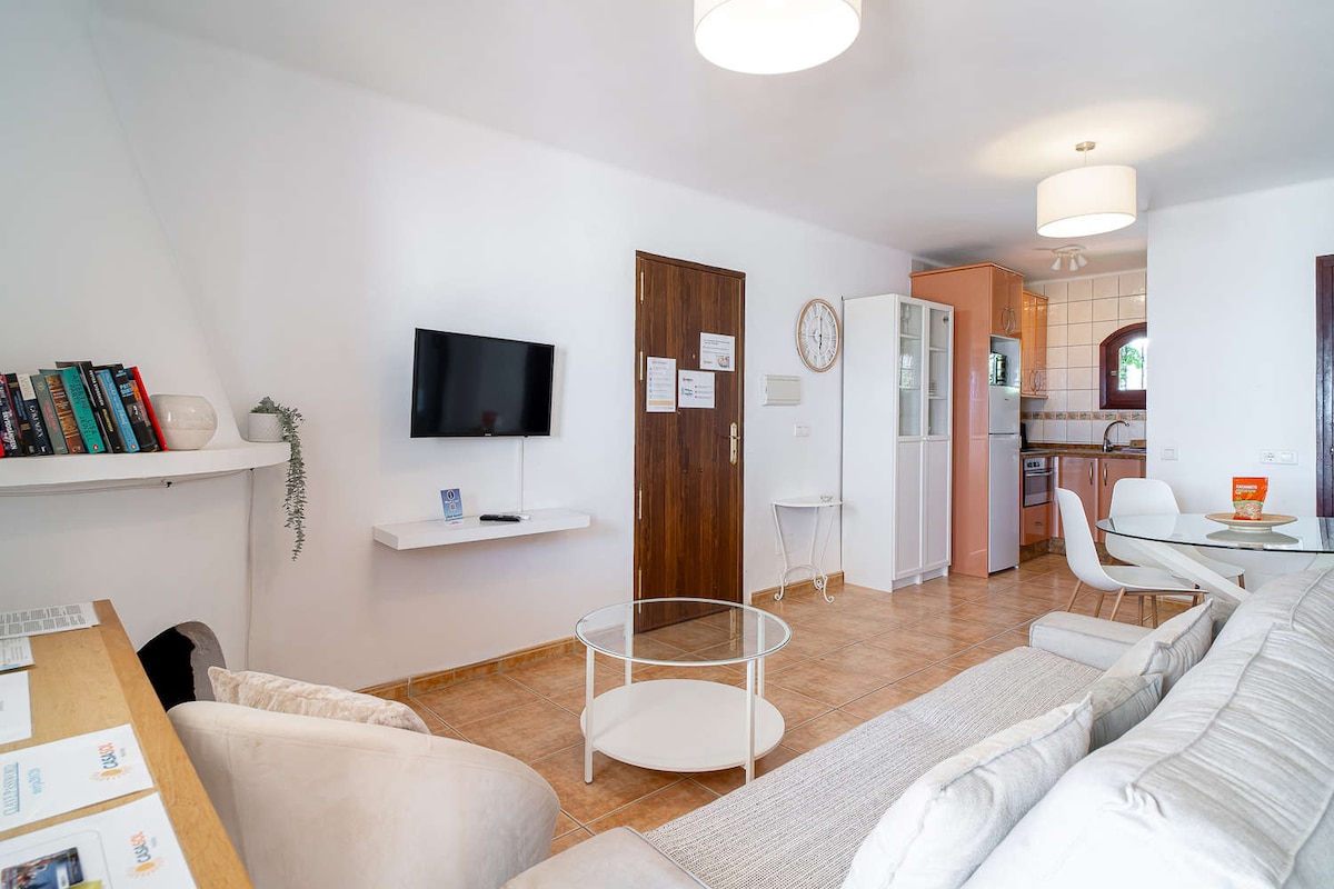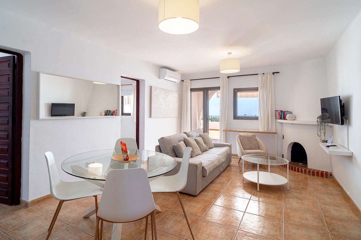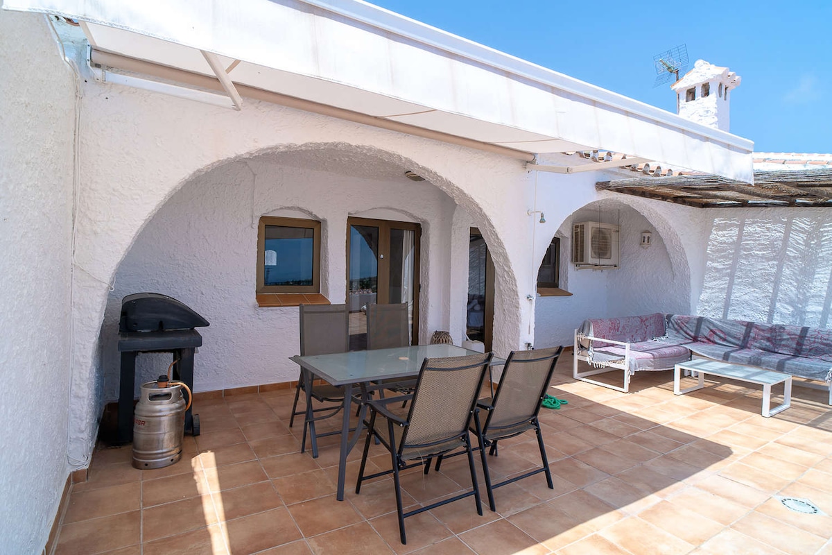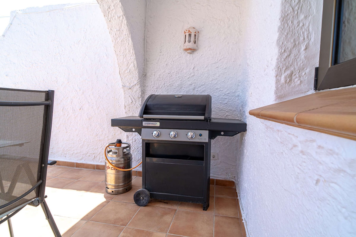 The property comprises of 2 generous sized bedrooms, a bathroom, and open plan kitchen, dining area and living room. The south facing terrace is unusually large for a 2 bedroom property and offers sun throughout the day while also providing a partly covered shaded area with a comfortable corner sofa with coffee table. It also offers a gas barbeque, dining table with 4 chairs, and 2 sun loungers.
