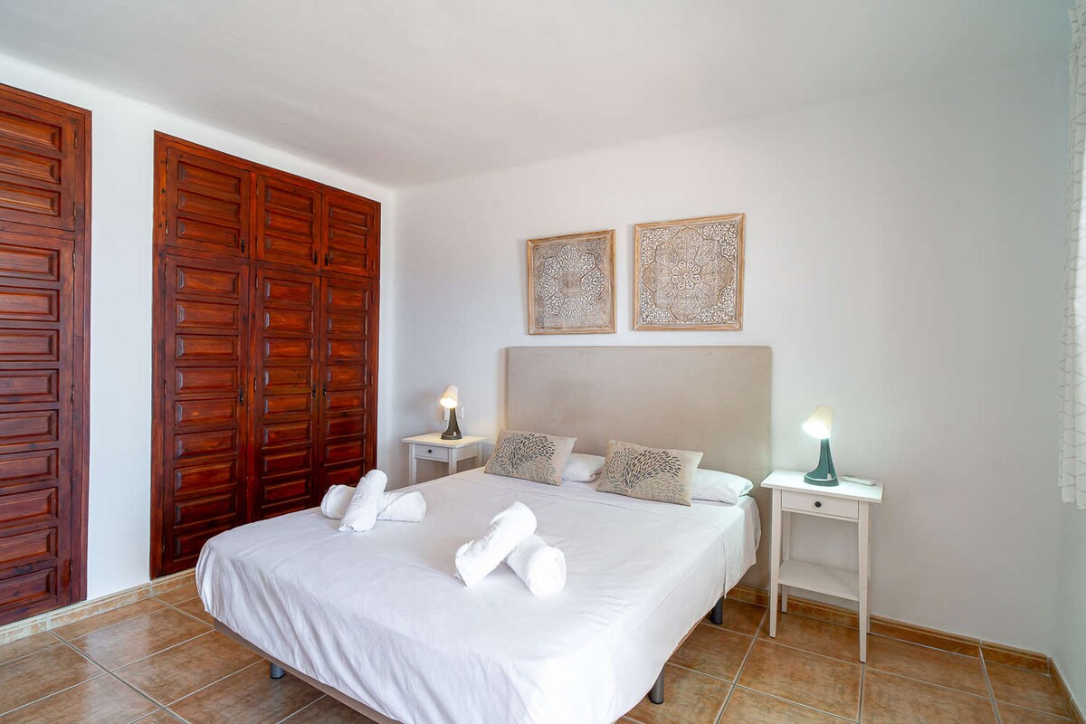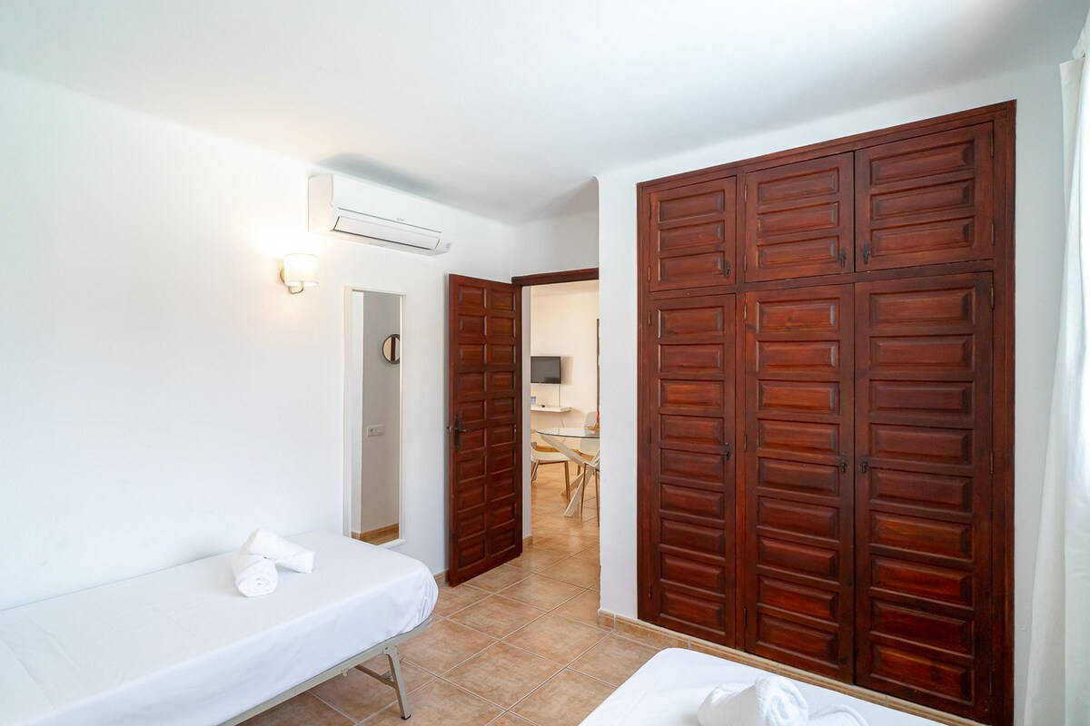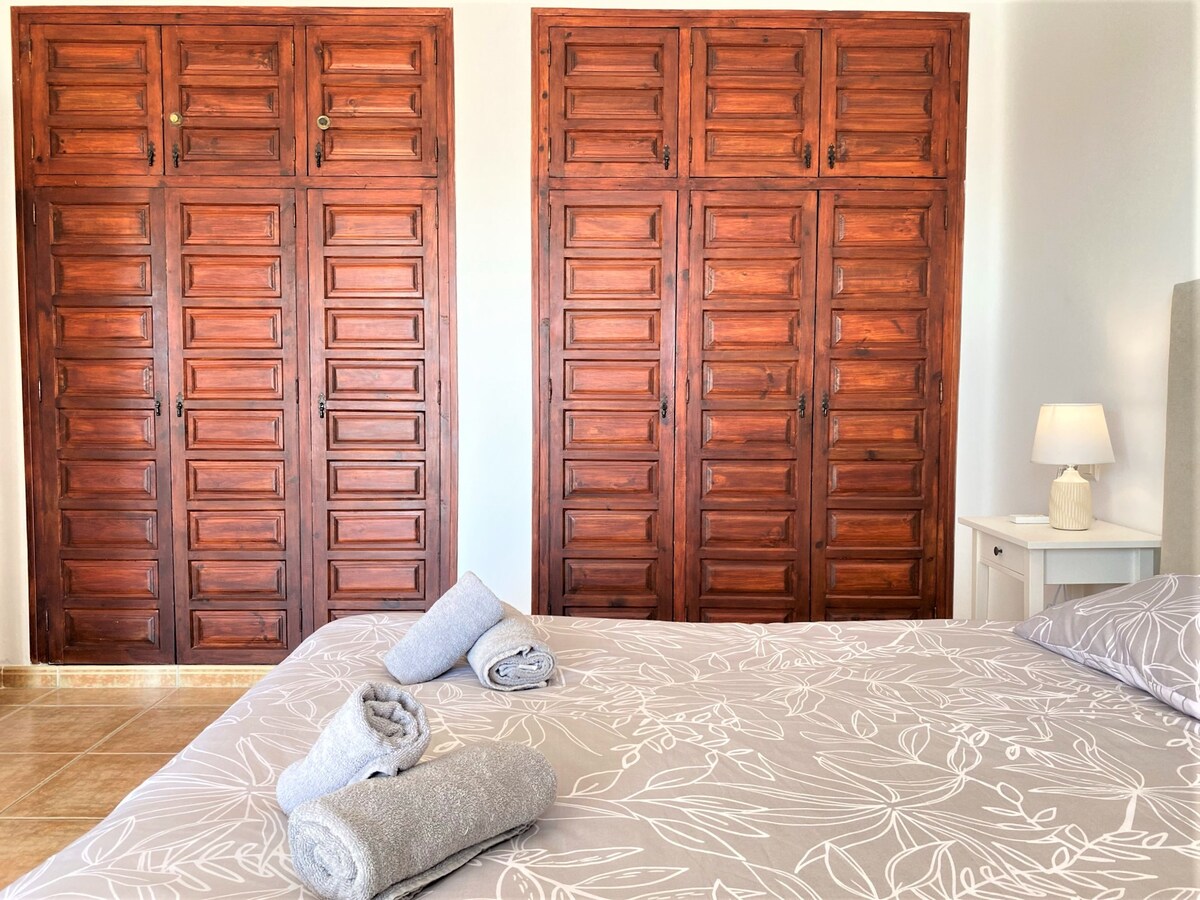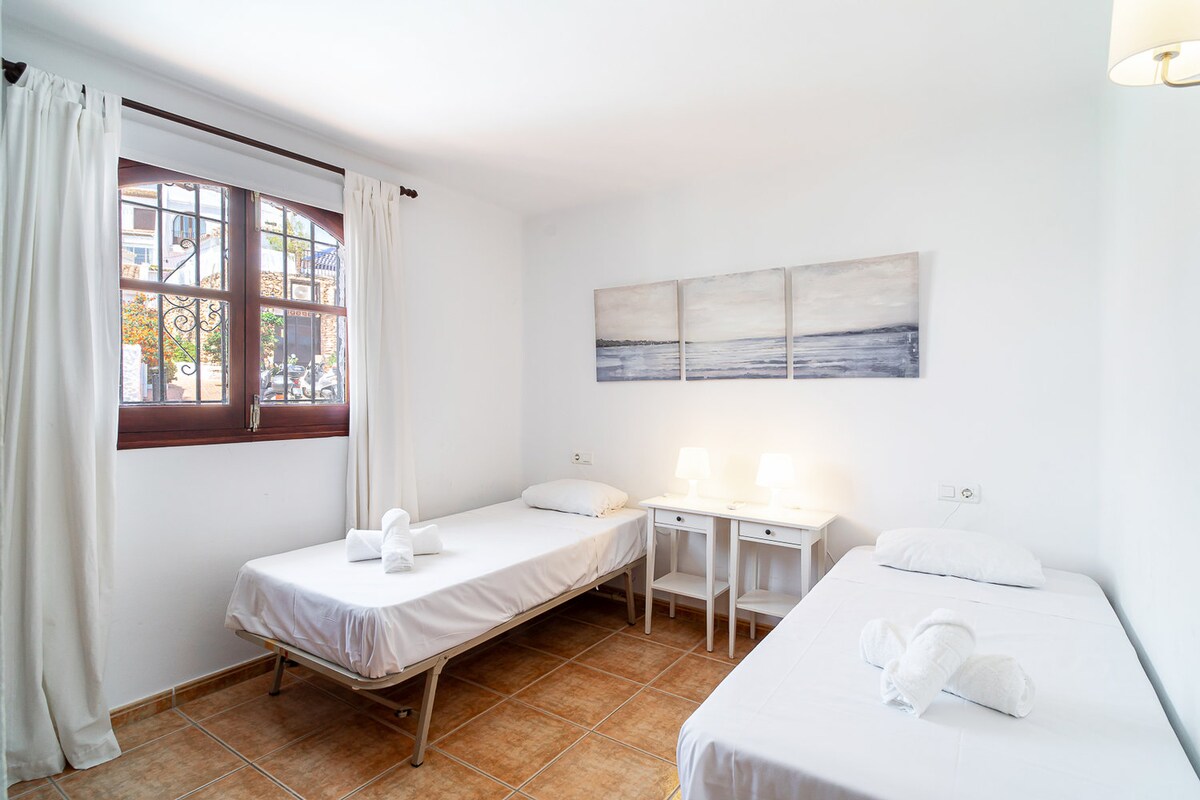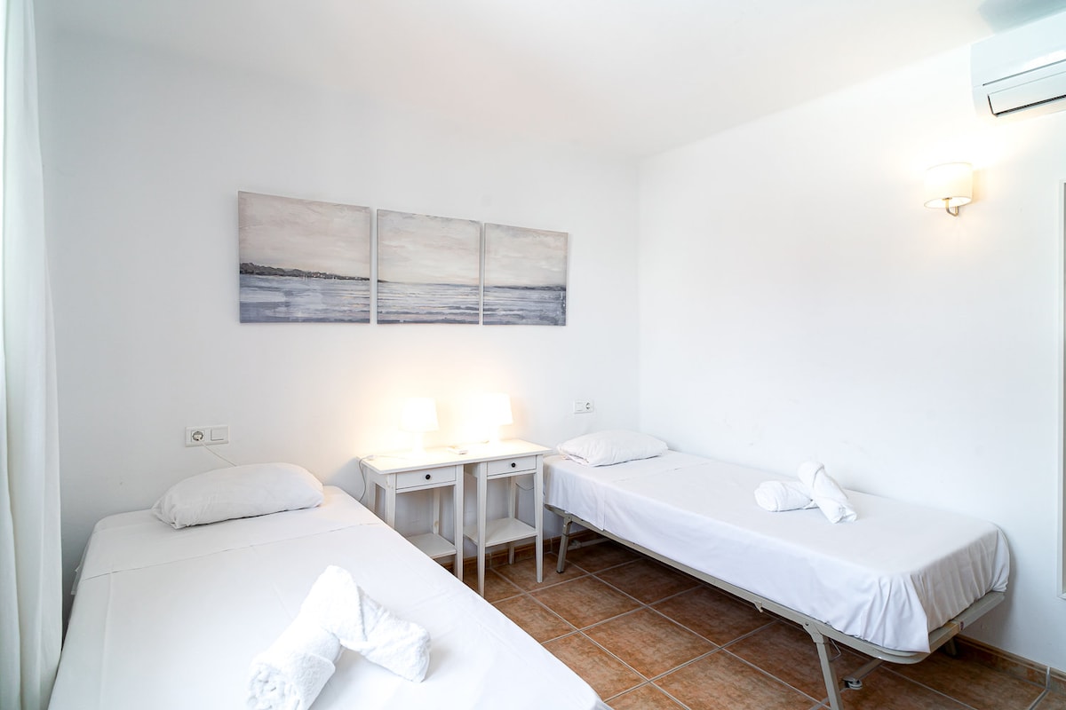 The apartment is light and both living room and master bedroom have double doors that open up onto the terrace. The master bedroom is generous in size and is furnished with a double bed with headboard, bedside tables and lamps, wall canvas, and double built-in wardrobes. The second bedroom comprises of twin beds, bedside tabled and lamps, wall canvas and built-in wardrobes.