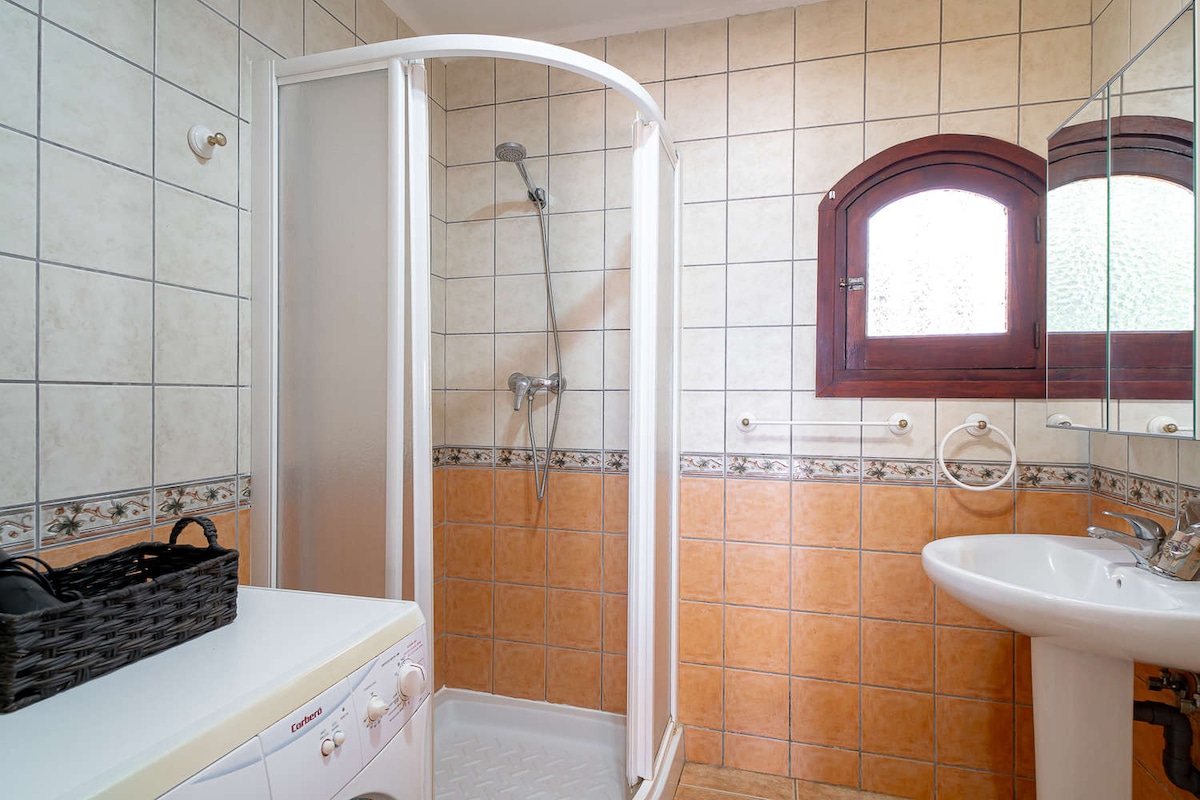 The shared bathroom has a shower, toilet, sink with mirrored cabinets and washing machine.