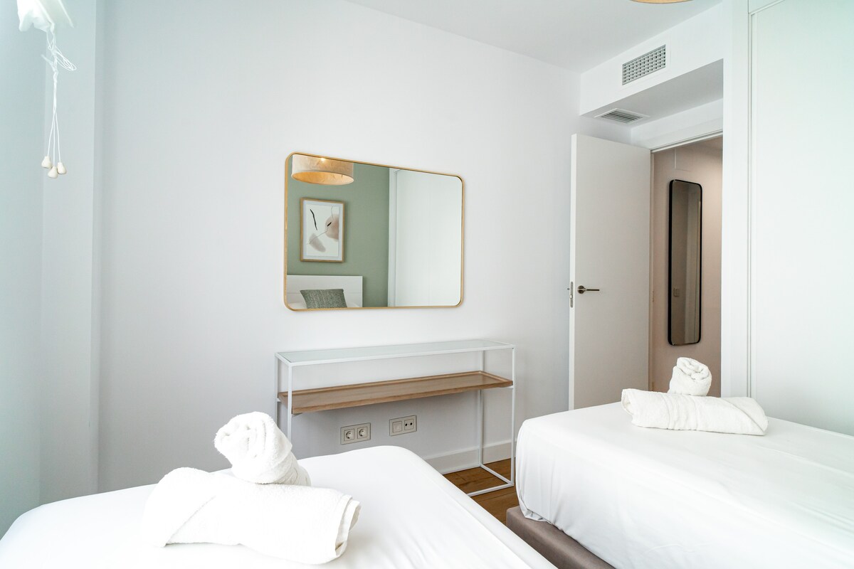 This luxury holiday flat features two elegantly furnished bedrooms: a master suite with a King Size bed (180x200 cm) and an en-suite bathroom, and a second bedroom with two single beds (90x200 cm). There is also a pull-out desk and a safe in which laptops of the usual size can be conveniently and securely stored.