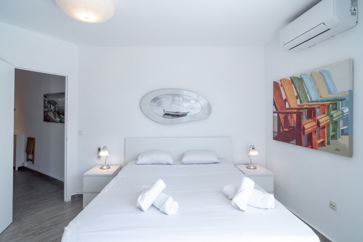 The master bedroom boasts a high-quality and comfortable double bed positioned towards the seaside, providing a breathtaking view to wake up to. The second bedroom features two equally comfortable and high-quality single beds.