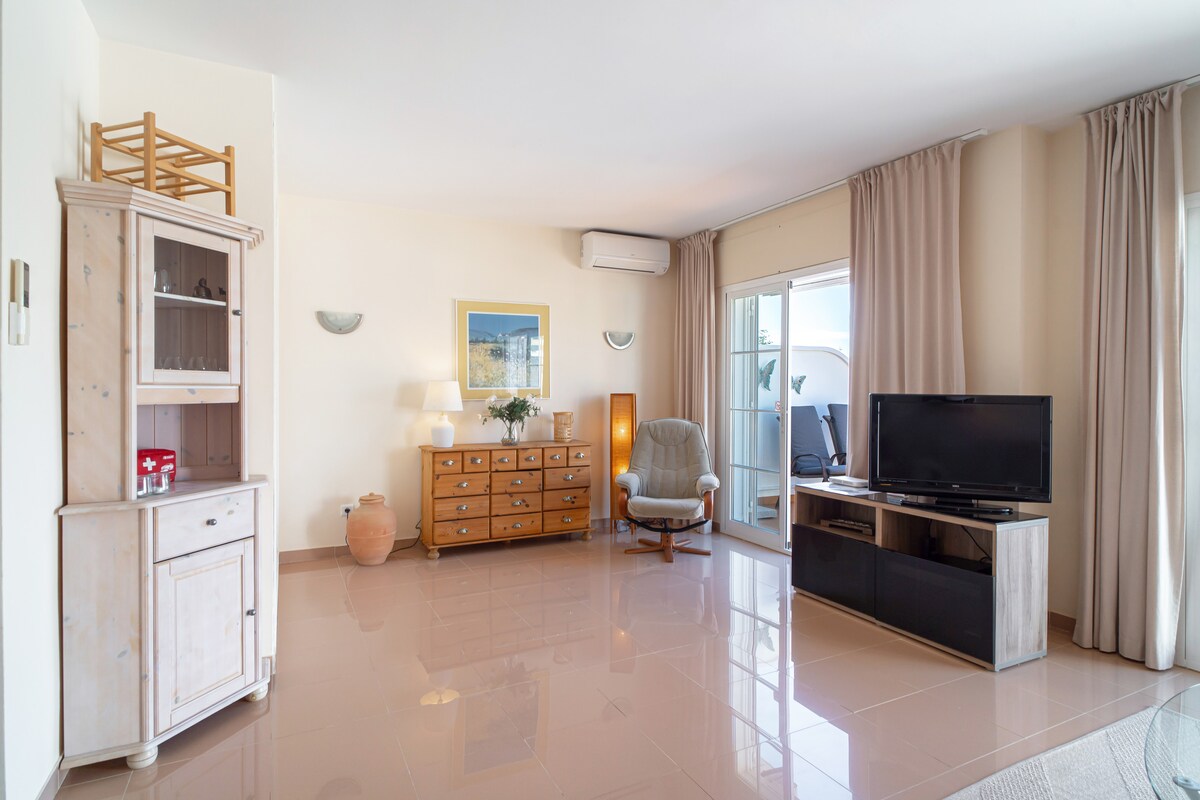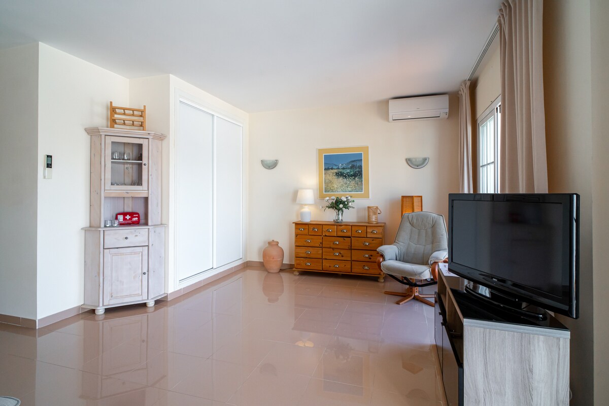 The apartment features a spacious master bedroom with a double bed and an en suite bathroom, as well as a second bedroom with two single beds, both equipped with high-quality mattresses for a great night's sleep. To ensure your comfort, the apartment is equipped with air conditioning, so you can enjoy a cool and comfortable stay, even on the hottest of days.