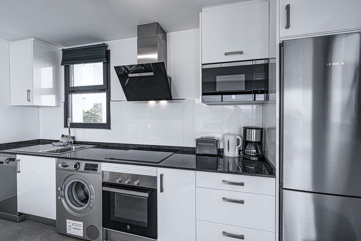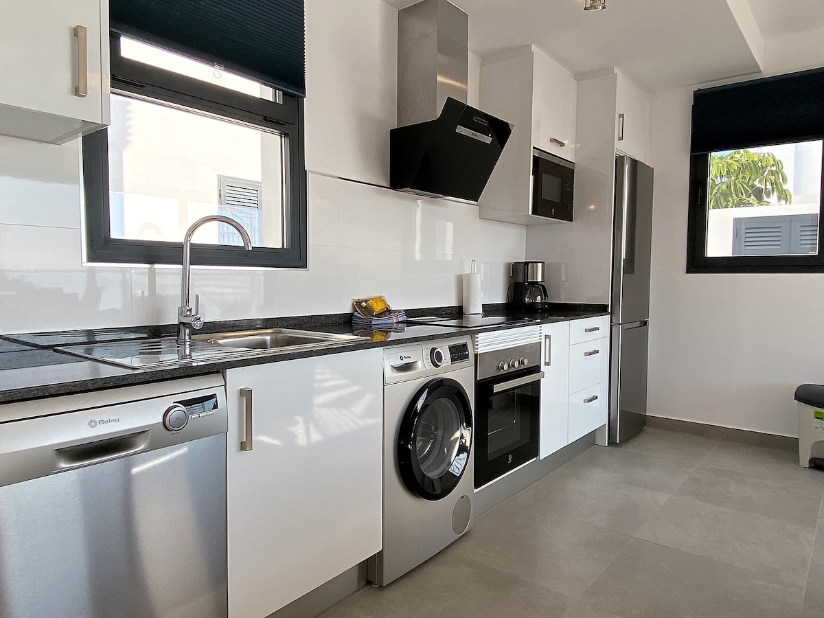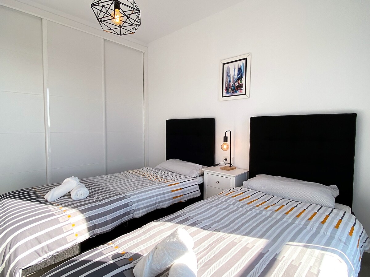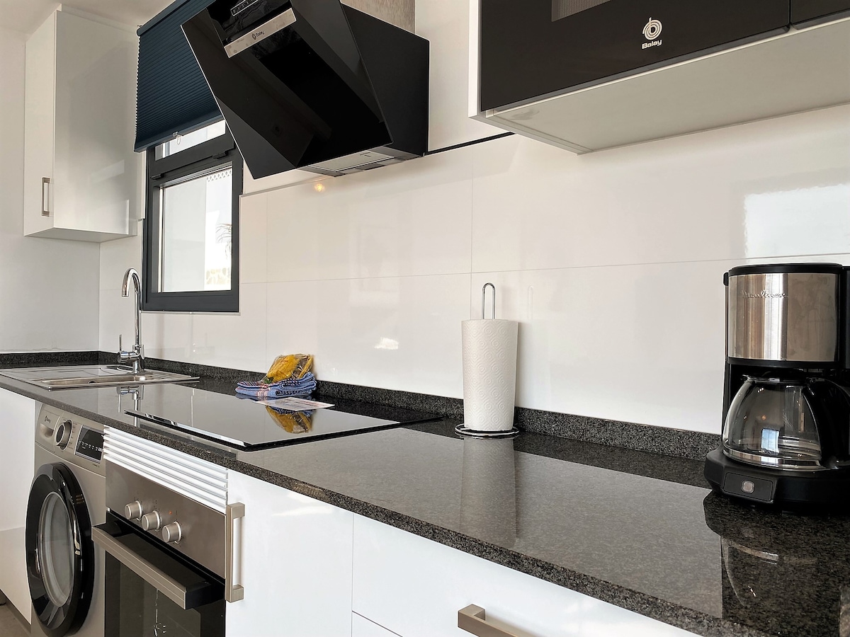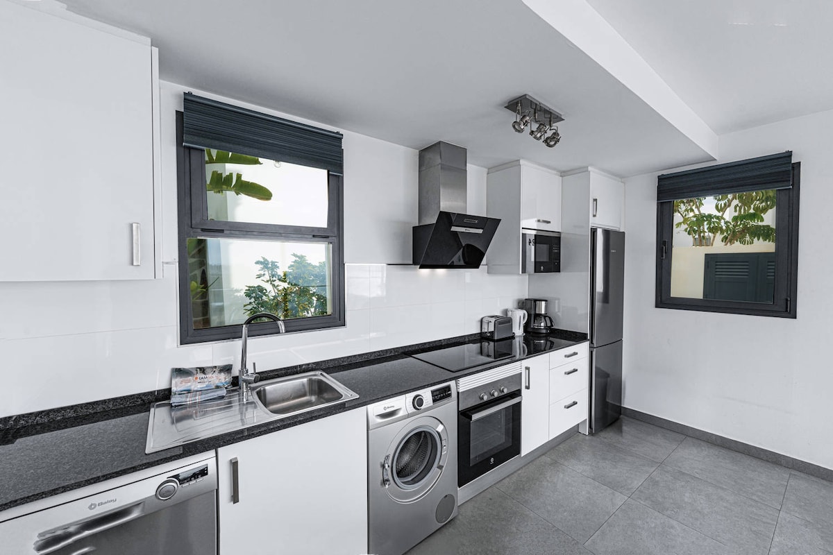 Super modern apartment with fantastic views and a lovely private terrace, clean and easy to keep clean. The gym is also a very nice touch. Only issues were when it was windy, you could not enjoy outside and also this meant the pool was cold and windy and leaves and dirt blew into the pool, it also wasn’t cleaned for several days. Note for other guests, the main bins are a 5 minute drive and you are quite far away from the good beaches, Overall very nice stay.