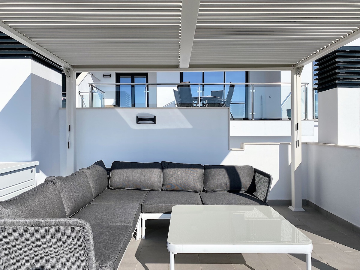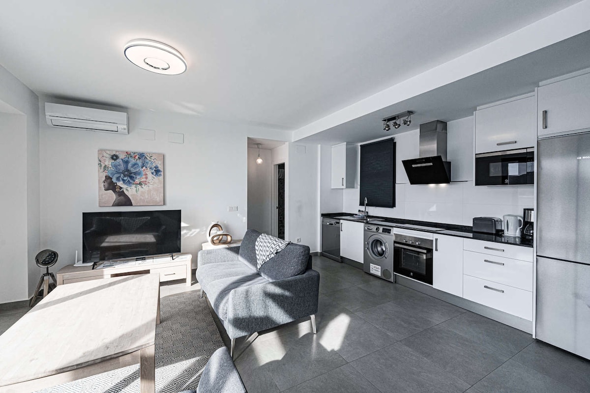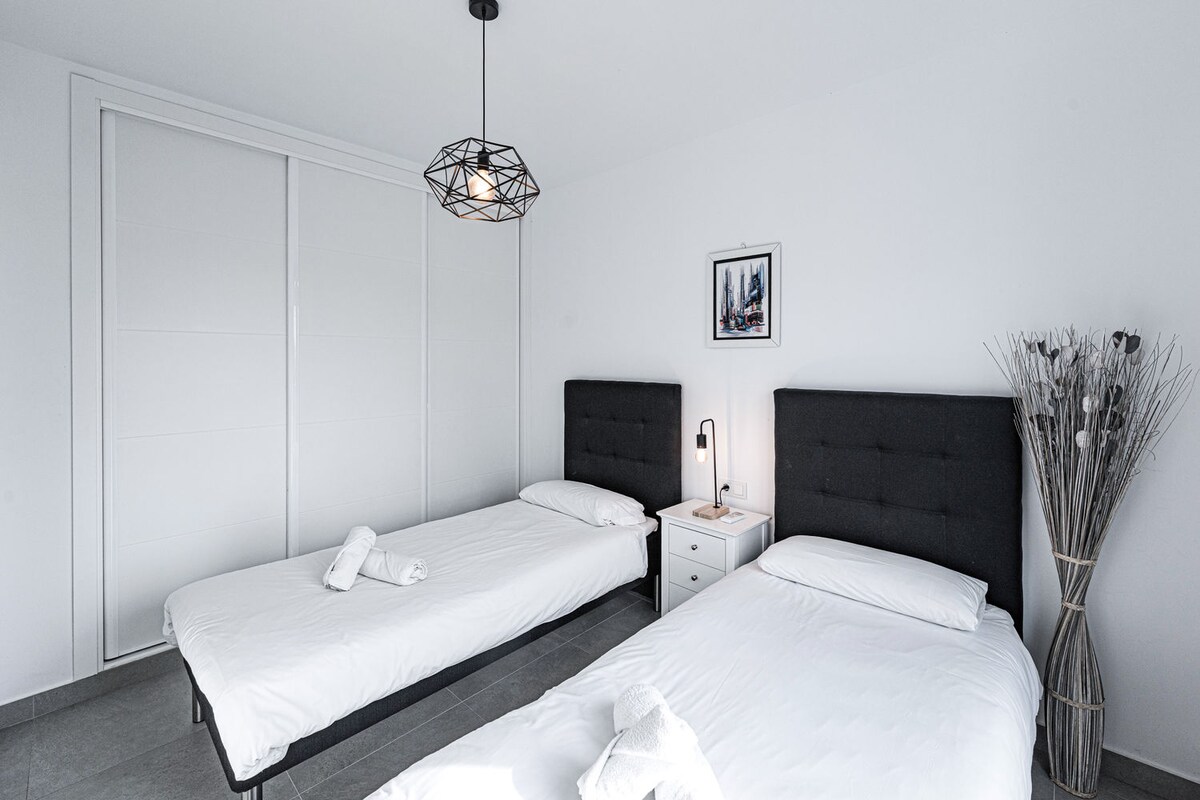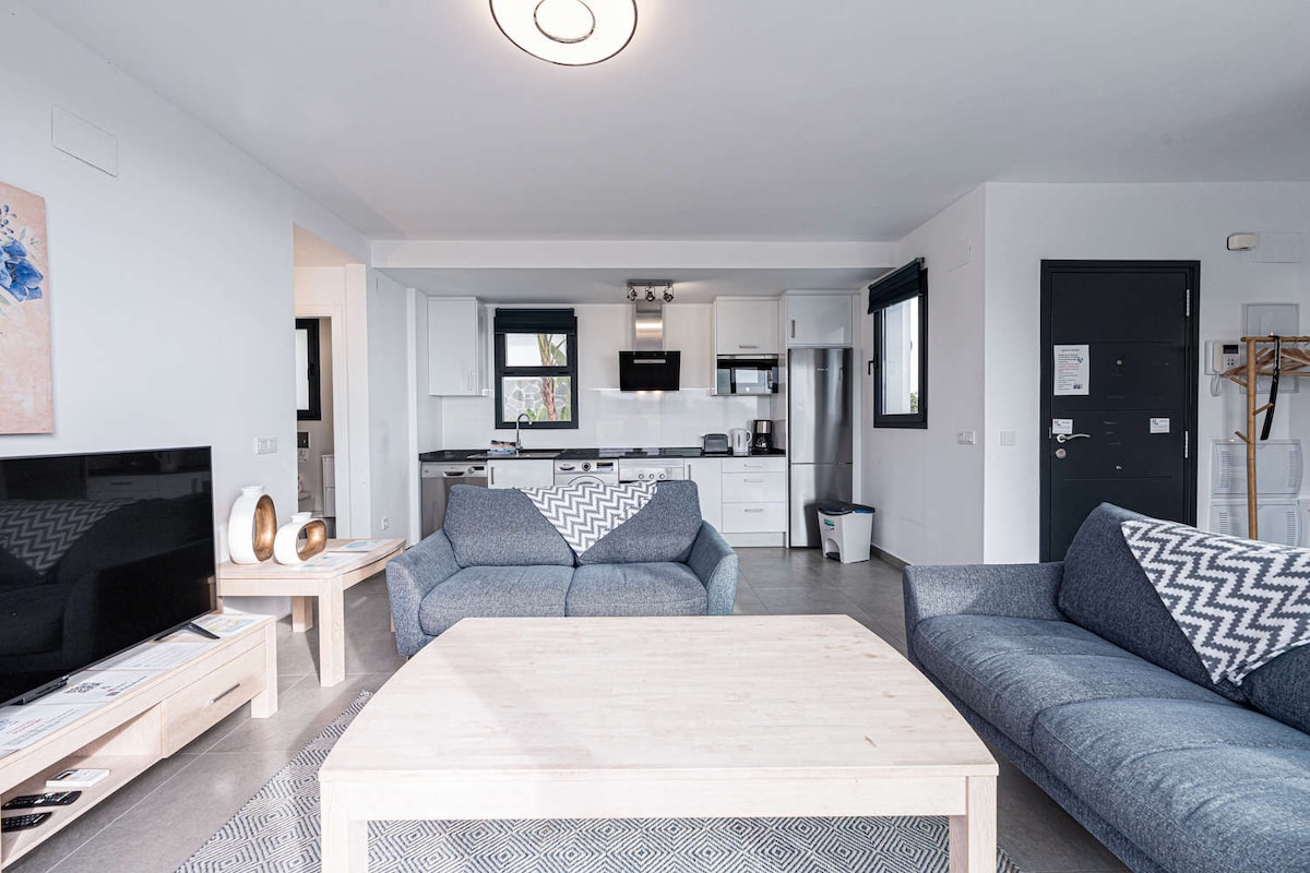 Super modern apartment with fantastic views and a lovely private terrace, clean and easy to keep clean. The gym is also a very nice touch. Only issues were when it was windy, you could not enjoy outside and also this meant the pool was cold and windy and leaves and dirt blew into the pool, it also wasn’t cleaned for several days. Note for other guests, the main bins are a 5 minute drive and you are quite far away from the good beaches, Overall very nice stay.