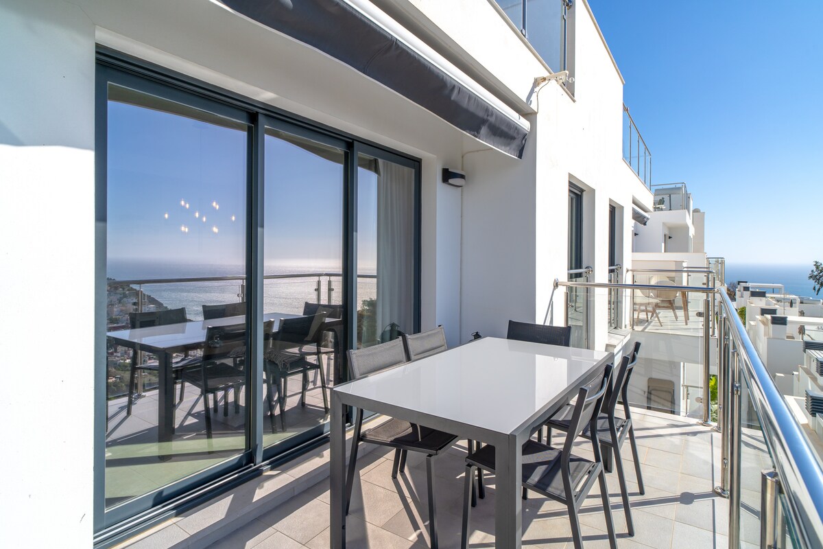 Taste the ultimate luxury and relaxation in our spectacular corner duplex penthouse with incomparable sea views and plenty of privacy. Enjoy the beautiful views from several terraces, with barbecue and sun loungers.Perfectly connected to the nearby towns of Torrox Costa and Nerja, in the heart of the east coast of Malaga, in the new complex Balcon del Mar.
