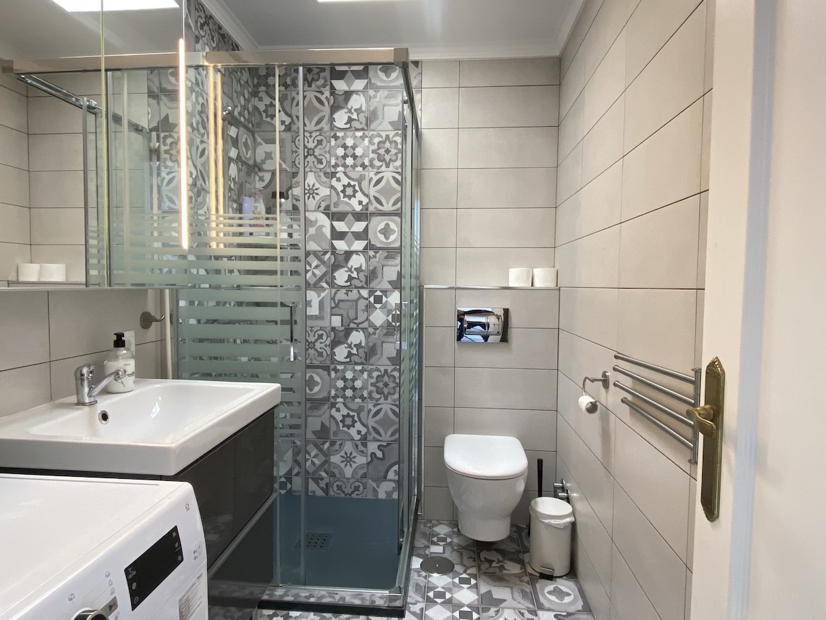 Also, on this level a modern bathroom with shower, toilet, sink and washing machine (with integrated dryer). There is also an iron and ironing board and a hair dryer.