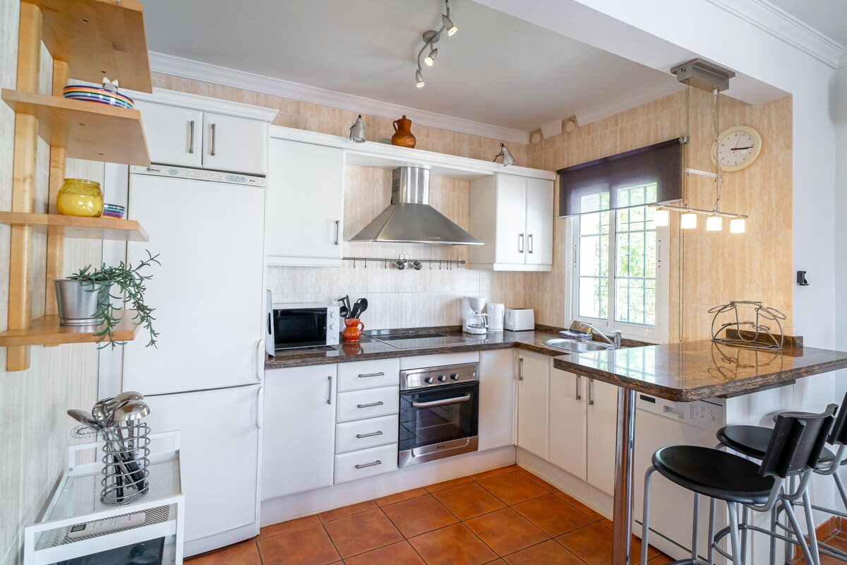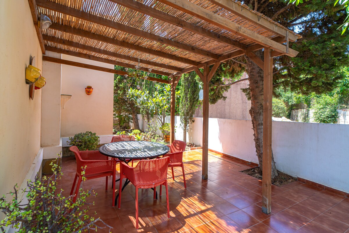 Dine al fresco at the outdoor dining table or relax on the comfortable lounge sofa, a perfect spot for enjoying the Mediterranean climate. Behind the house, you'll find a charming barbecue area complete with a dining table, designed in a typical Spanish patio style, an ideal setting for evening meals and gatherings.
