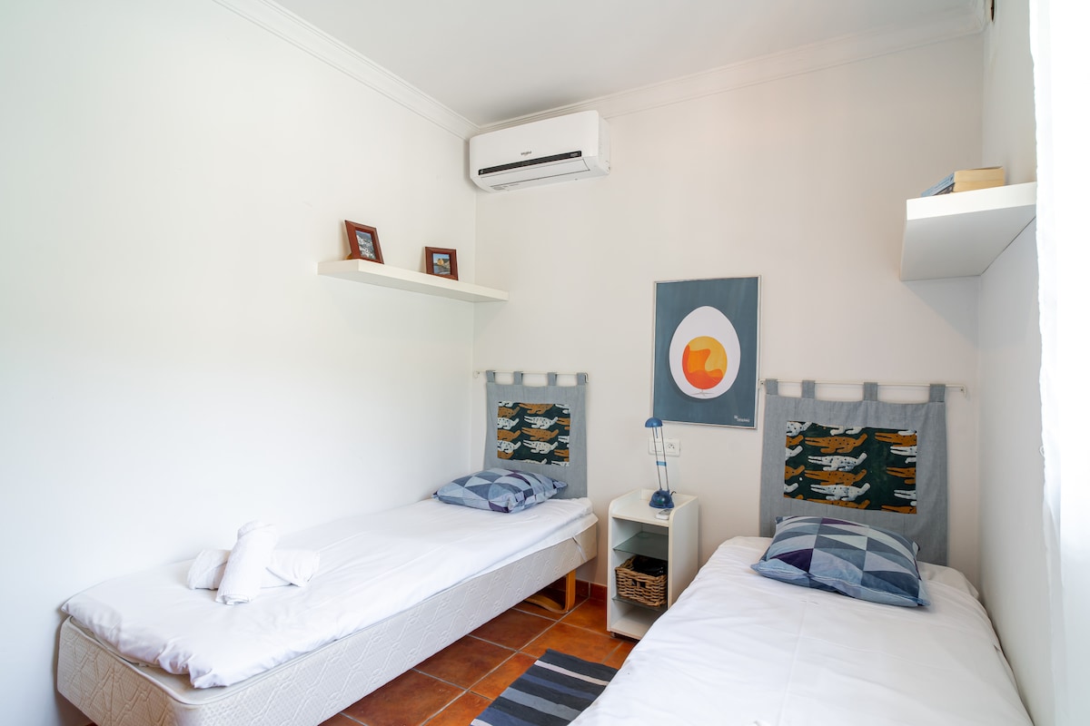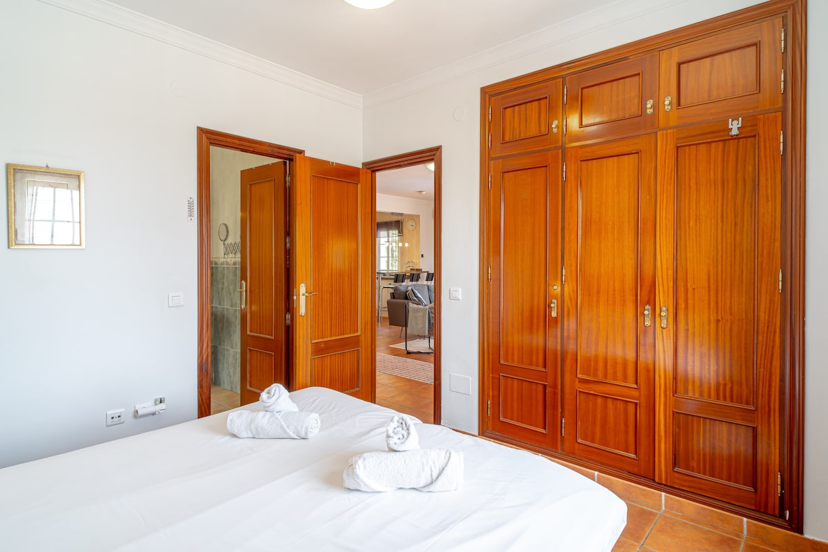 The villa has three bedrooms: a master bedroom with a king-size bed (180x200), a second bedroom with two single beds, and a third bedroom with a sofa bed, perfect for children.