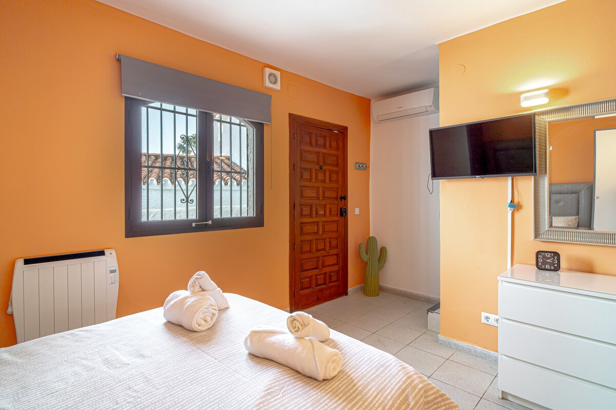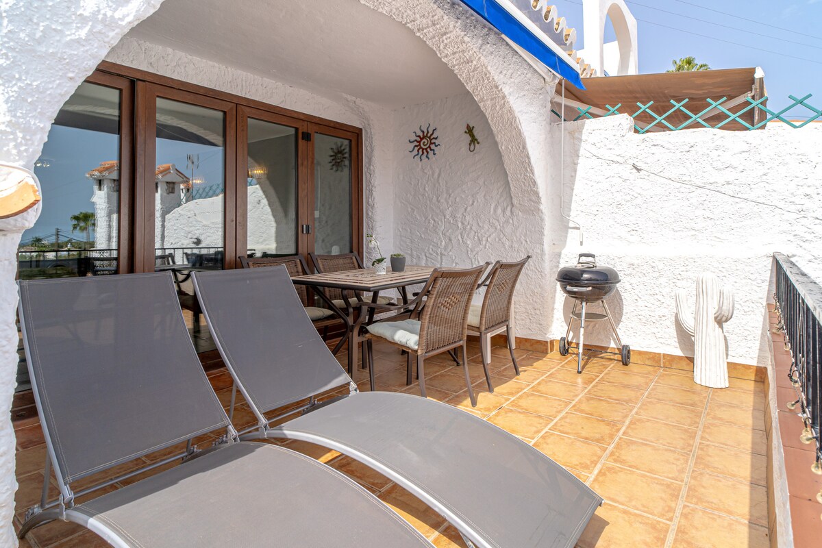 Capistrano Village's Cactus Casasol presents a charming one-bedroom apartment spanning two levels. Upon entering, you'll find a tastefully adorned living area seamlessly integrated with an open-plan kitchen boasting modern appliances. Step out onto the terrace on this level, where you'll discover barbecue facilities, dining space, and comfortable sun loungers. Take advantage of complimentary high-speed WiFi (300mbit/sec fiber) and entertainment amenities provided by a flat screen Tv. Additionally, on this level, there is a convenient shower bathroom for your use.The lower level presents a snug double bed with premium mattresses, guaranteeing a restful night's sleep. Blackout shutters are included to enhance your sleep quality. Both the bedroom and living room are equipped with air conditioning for your utmost comfort. Additionally, there's access to a charming private patio, perfect for relaxation or enjoying an e-book in the shade. Another shower bathroom is conveniently located on this level for your convenience.