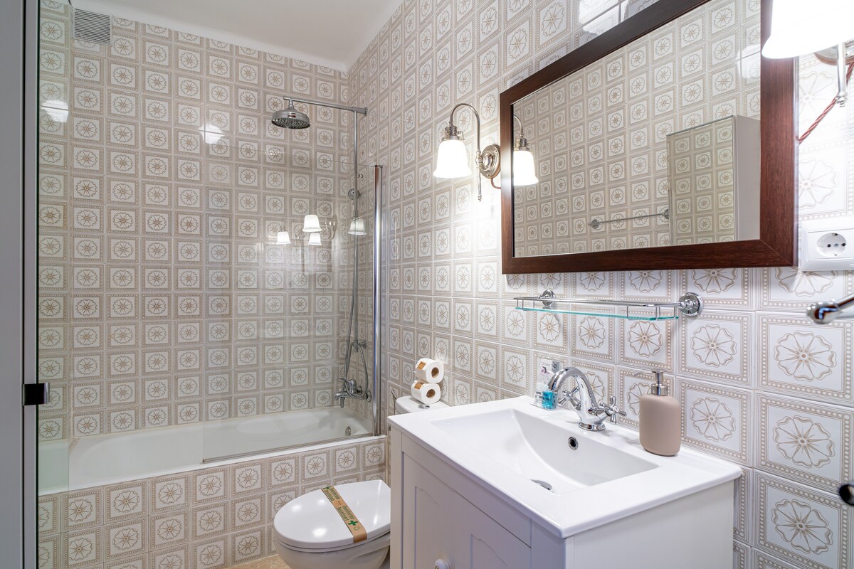 A cozy double bed featuring high-quality mattresses ensures a comfortable night's sleep. Blackout shutters are provided for optimal rest. The wardrobe comes with a newly designed practical interior for added convenience. The bathroom has been tastefully renovated in a retro style. Air conditioning is available in both the bedroom and living room to ensure your comfort. Enjoy complimentary high-speed WiFi (300mbit/sec fiber) and entertainment options with a Samsung smart Tv and Apple TV.