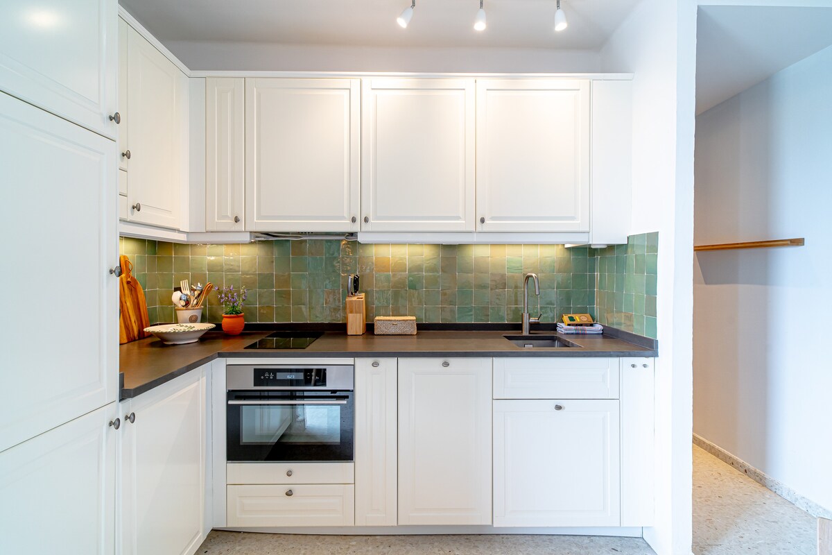 The living room seamlessly integrates with the open-plan kitchen, boasting modern amenities including a well-equipped kitchen with sleek stonework surfaces.A cozy double bed featuring high-quality mattresses ensures a comfortable night's sleep. Blackout shutters are provided for optimal rest. The wardrobe comes with a newly designed practical interior for added convenience. The bathroom has been tastefully renovated in a retro style. Air conditioning is available in both the bedroom and living room to ensure your comfort. Enjoy complimentary high-speed WiFi (300mbit/sec fiber) and entertainment options with a Samsung smart Tv and Apple TV.