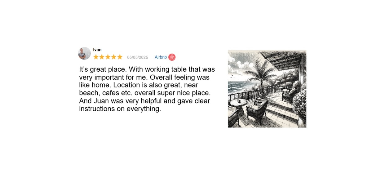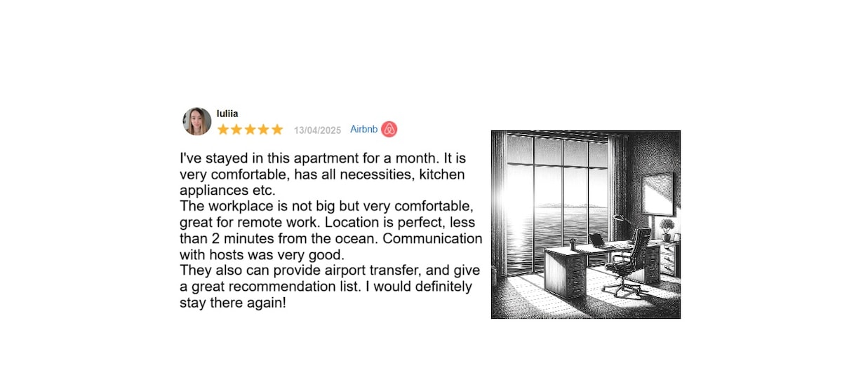 Communication with the team was excellent in all formats. The information sent to me before arrival was excellent. I had a couple of issues during my two week stay and both were dealt with straight away satisfactorily. The apartment feels bigger than the photos and the couch is large and comfy. The apartment is clean and has all the amenities you will need for a two week stay. The location is just a couple of minutes from the heart of the promenade. There are almost countless cafes bars and restaurants within two minutes walk. A spar shop is almost on the doorstep. The balcony is nice and is always in the shade which is what I personally like. There is noise from some construction around the area and the streets are lively at the weekend but you are in the centre. I am happy that I stayed there.