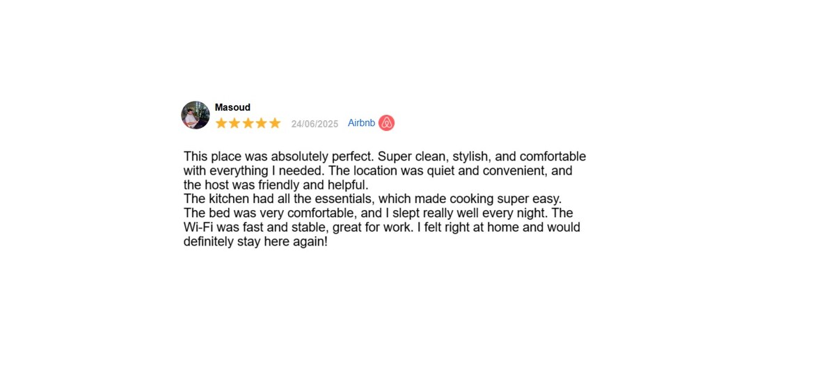 This place was absolutely perfect. Super clean, stylish, and comfortable with everything I needed. The location was quiet and convenient, and the host was friendly and helpful. The kitchen had all the essentials, which made cooking super easy. The bed was very comfortable, and I slept really well every night. The Wi-Fi was fast and stable, great for work. I felt right at home and would definitely stay here again!