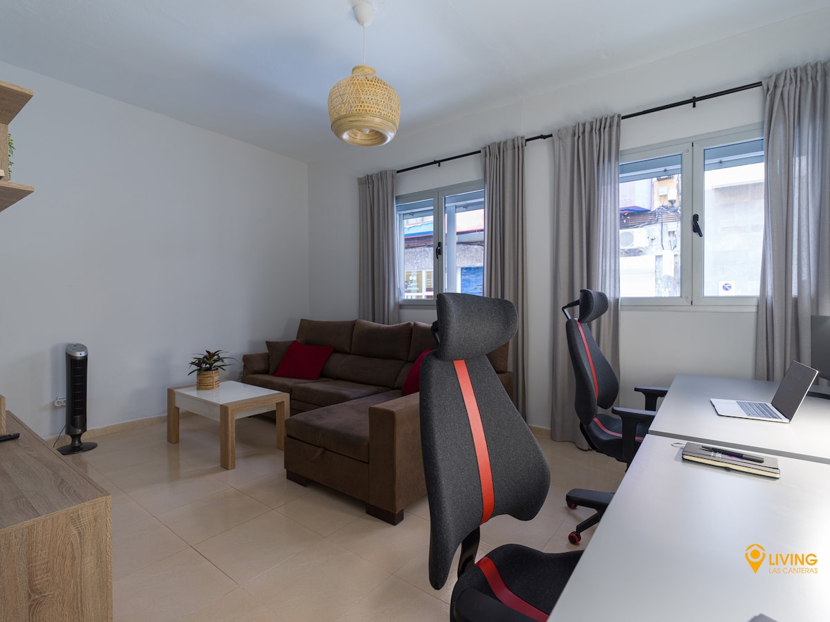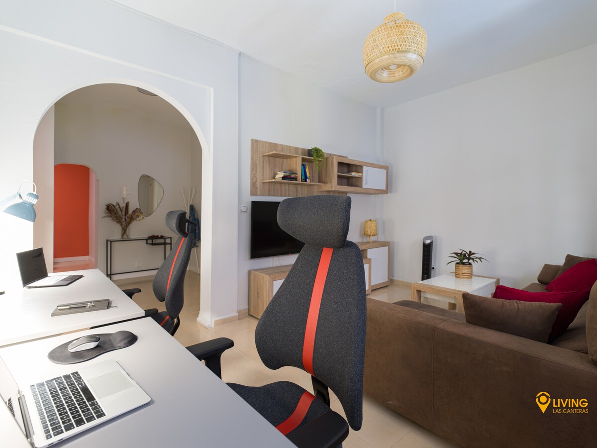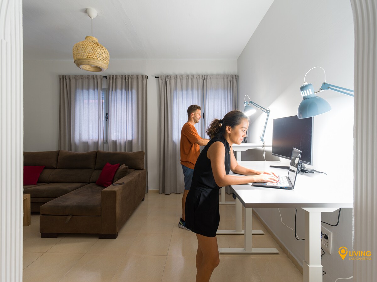Excellent location for telework, beach, restaurants, grocery shops and walks by the sea. The Living Las Cantera Team was very nice and responsive, and had very well prepared instructions before the stay and before checkout. As advertised, the apartment is located just 2 minutes from the sea shore, and there is a nice seaside promenade, with restaurants and shops, as well as a sandy beach. The apartment is spacious and clean (although a bit dark), it has two regulated desks, two screens and a decent wifi connection (it was a bit weaker on some days, though). Well equipped kitchen, large (and quiet) fridge. Everything you need even for longer stays (we stayed there for almost 2 weeks). The free parking spot in a nearby indoor car park is an added value. Neighbours can be a bit loud at night. Overall a very good place for telework combined with holidays.
