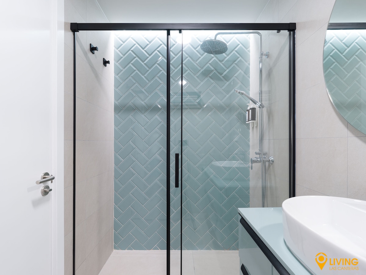 ★ The BATHROOM, with its white and marine-themed design, offers a SPACIOUS WALK-IN SHOWER and a vanity unit with 2 drawers. We provide 2 sets of bath towels and 1 beach towel per guest, a hairdryer, and gel and shampoo dispensers for your convenience.