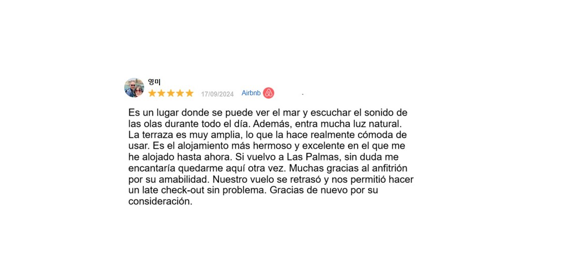 It is a place where you can see the sea and hear the waves all day. The sunlight comes in well. The terrace was very spacious, so it was really convenient to use. It's the most wonderful and beautiful place I've ever used. I would definitely stay there again if I come to Las Palmas next time. Thank you for your kind response, host. The plane departure was delayed, but they were willing to allow us to check out late. Thank you for your kind understanding.