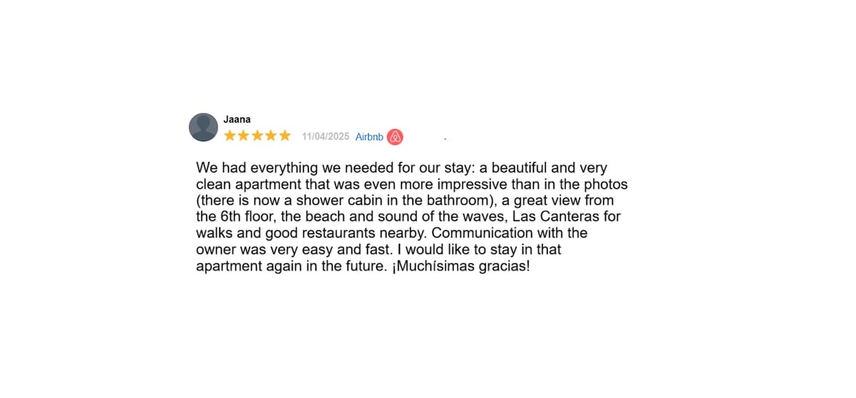 We loved our stay here and would definitely consider returning. The Living Las Canteras Team were excellent communicators (friendly, quick, and helpful), although we didn't need to speak too much because the instructions and information was so clear. The property has an excellent location and was well equipped. The only slight downsides would be the kitchen (which is exactly as shown and described) which we expected, and low water pressure (which is common for all properties in this area). Apart from that it was easy to stay there for two weeks and we could have stayed longer. We felt the property was excellent value, but we booked last minute and the price was very low compared to other dates in the future that we checked. We would definitely consider a property through Living Las Canteras for our next visit to Las Palmas.