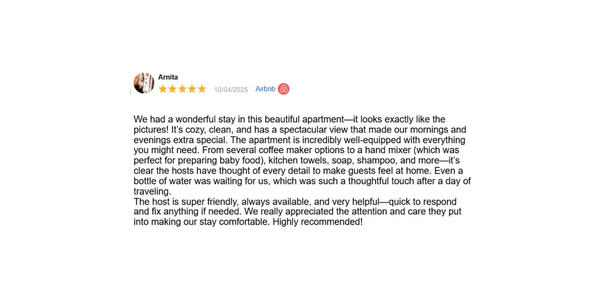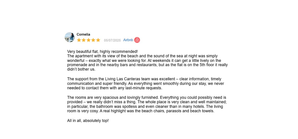 Very nice apartment, highly recommended! The apartment with the view of the beach and the sound of the sea at night were simply fantastic - exactly what we wanted. On the weekends, it can get a little louder on the promenade and in the surrounding restaurants, but since the apartment is on the 5th floor, it was not disturbing for us. The support from the Living Las CANTERAS team is impeccable, clear information, timely communication and super nice. Since everything worked out during our stay, there was no need to contact the team with spontaneous requests. The rooms are very spacious and lovingly furnished. There is everything you need. We definitely didn't miss anything. The entire accommodation is very clean and well maintained, especially the bathroom is cleaner and more immaculate than in many hotels. The living room is very cozy. An absolute plus were the beach chairs, parasols and beach towels. All in all great