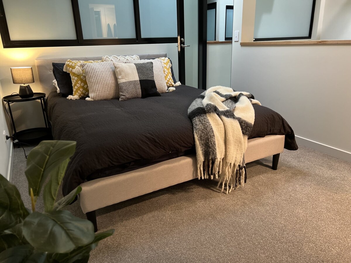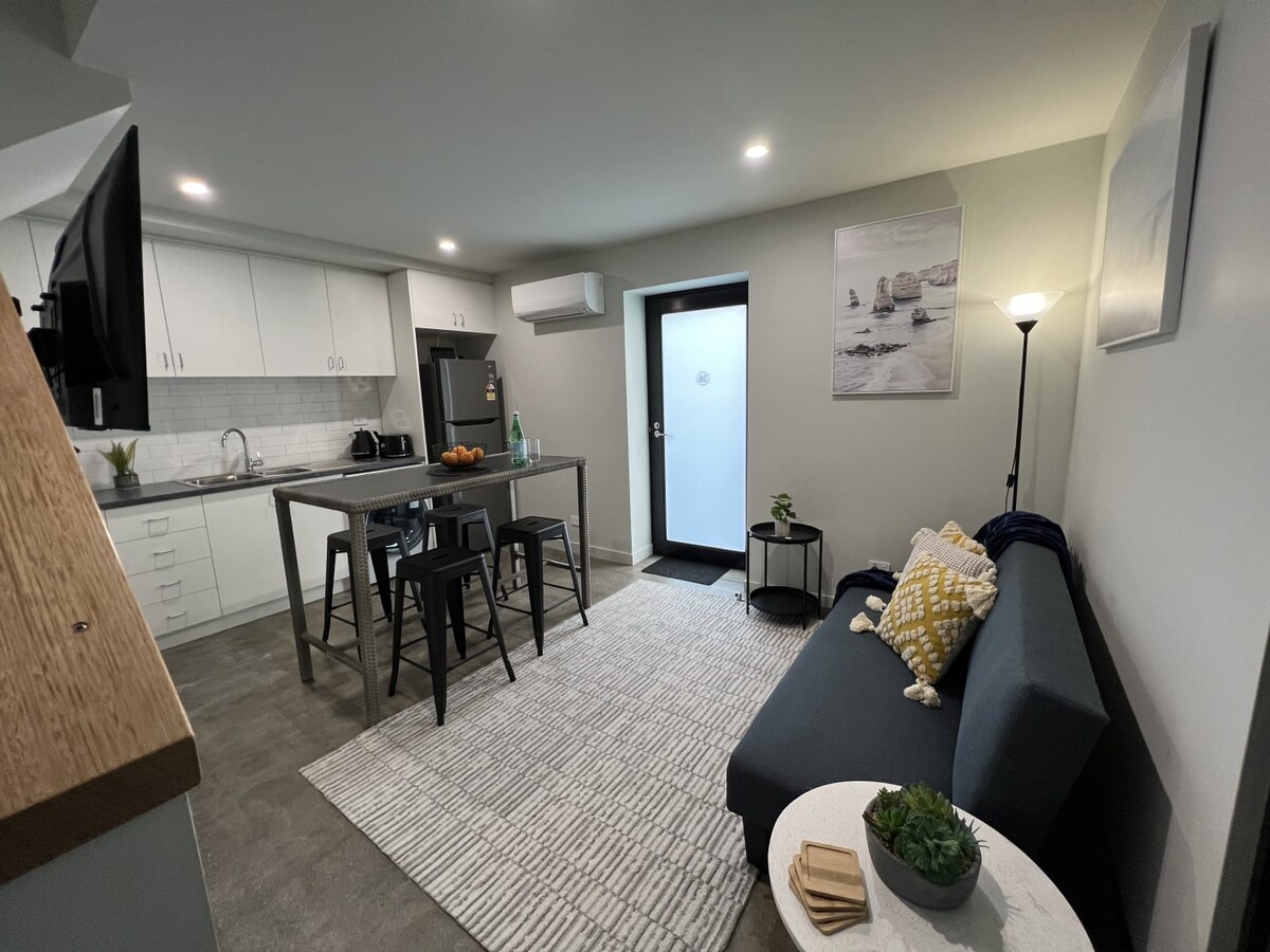 Enter the apartment into an open-plan kitchen/dining living space featuring concrete flooring and wall-mounted reverse-cycle air con. The kitchen comes equipped with a medium sized LG fridge, electric cooktop and under-bench oven, double sink and a tall table with 4 stools. There’s also an under-bench Haier combined washing machine/clothes dryer. The lounge area has a couch which converts into a single bed if needed, a rug for winter comfort and a ‘smart’ TV. A flight of stairs takes you up to the loft bedroom with a skylight in the ceiling to let in natural light. The bedroom is carpeted and offers a queen-sized bed, built-in wardrobes with lots of space for longer stays and a door to a small balcony overlooking the interior hall of the building. The ensuite bathroom has stylish floor-to-ceiling tiling and a roomy shower recess with a glass screen.Guest access
