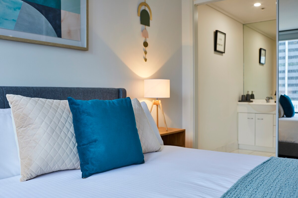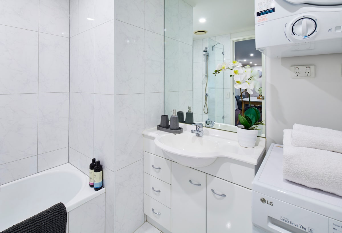 There are 2 carpeted bedrooms, both with built-in mirrored wardrobes and floor-to-ceiling windows, again featuring those expansive east-facing city views and block-out blinds for comfort. The master bedroom has a queen sized bed and its own en-suite with a shower, while the second bedroom comes with 2 single beds which can be pushed together to create a queen-sized bed if needed. The main bathroom has a bathtub with combined shower and also houses a washing machine and separate dryer.