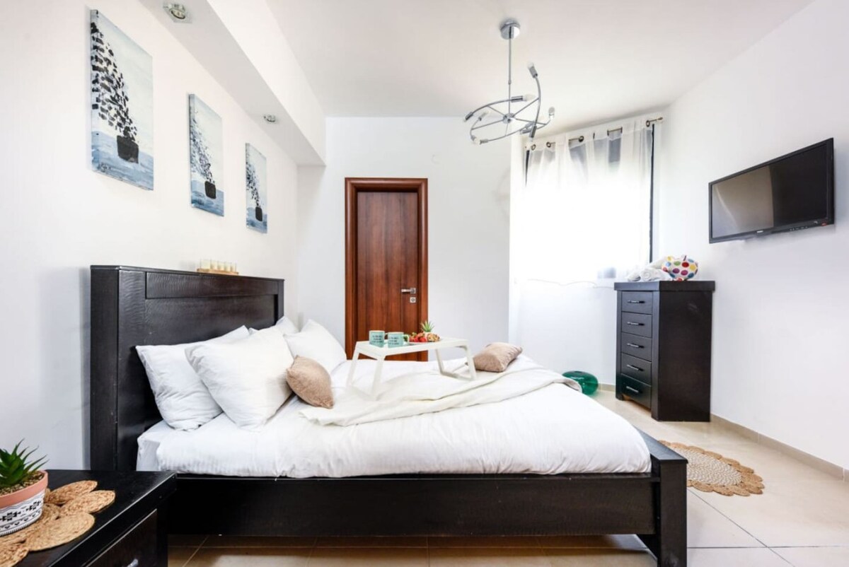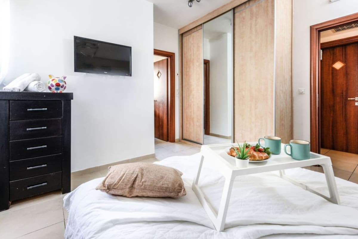 The apartment includes a Mamad (reinforced safe room) for your safety and peace of mind