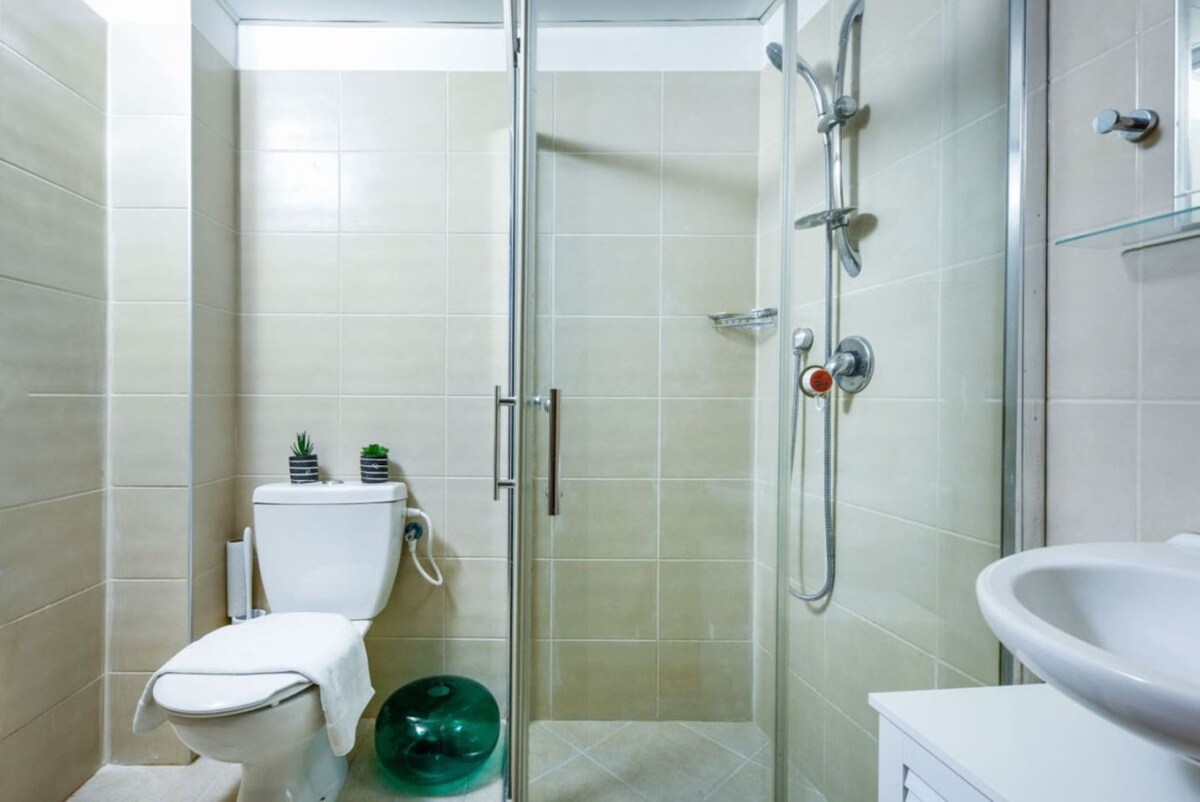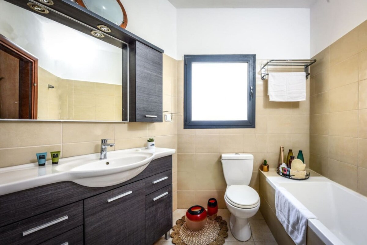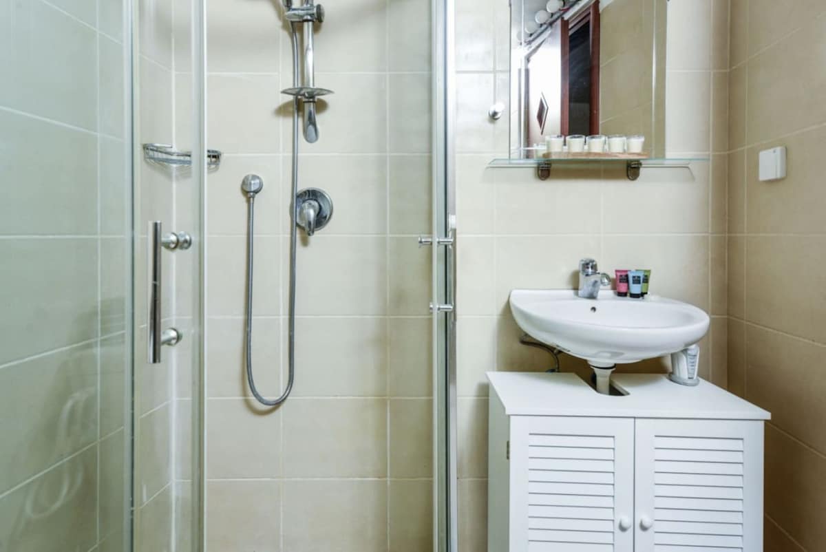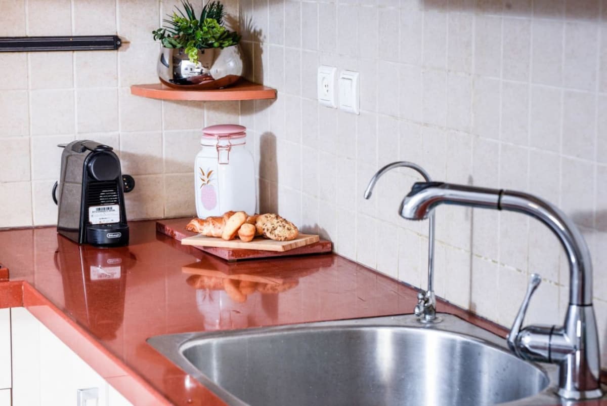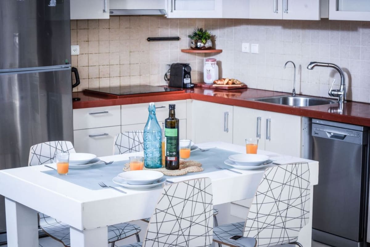 All in all, a good stay! Clean, Spacious apartment. Well equipped kitchen. Washing machine and dryer. complimentary snacks and coffee maker were a nice touch! Privet parking space - though very tight and will not fit tall vehicles Location - between Shuk Hacarmel and Dizzingof Center, 10 minutes walk to the beach. Was a bit tricky to locate - read the instruction in detail. There is one central A/C with vents in the main space and one in the master bed room only so other bed room was a bit hot during the night and you have to keep the door of it open.