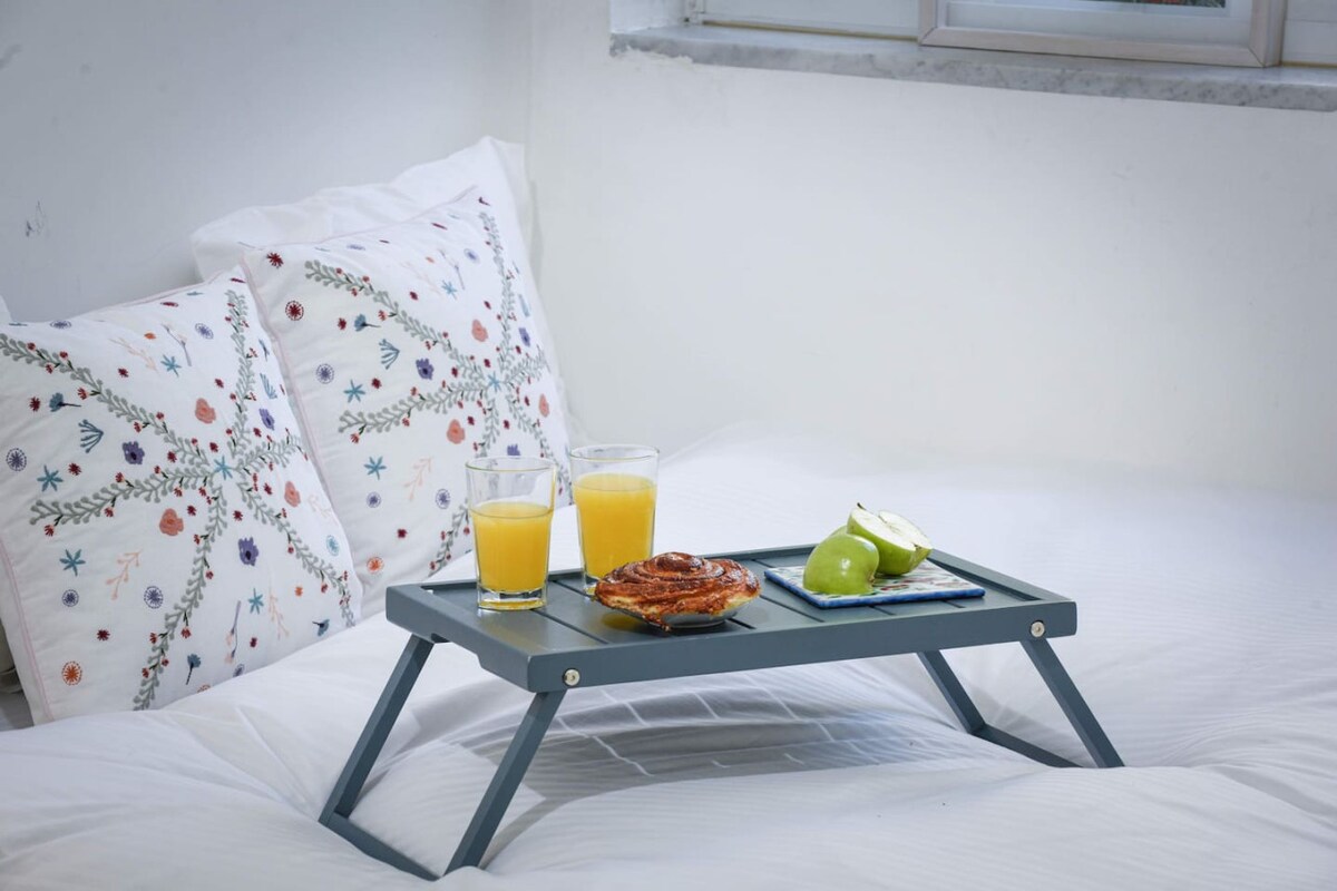 The living area is flooded with natural light, thanks to the large windows that open up to beautiful greenery outside. Inside, you'll find a modern and inviting space with comfortable seating—perfect for relaxing after a day of exploring the city. Enjoy your favorite shows on the widescreen TV or unwind with free WiFi.The fully equipped kitchen includes all the essentials for cooking, from a stove to a microwave and coffee maker. The dining area is ideal for enjoying a meal with friends or family.