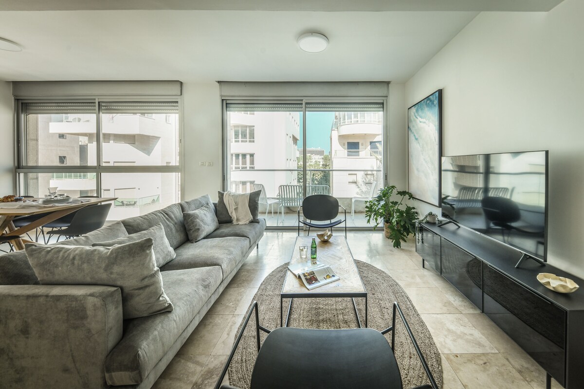 Step into a modern and bright space, where the spacious living room invites you to relax and unwind. Enjoy the abundance of natural light that fills the apartment, creating a warm and welcoming atmosphere.Indulge in your morning coffee or afternoon tea on the private balcony, a perfect spot to soak up the vibrant Tel Aviv ambiance. Sit back, breathe in the fresh air, and start your day or wind down in tranquility.