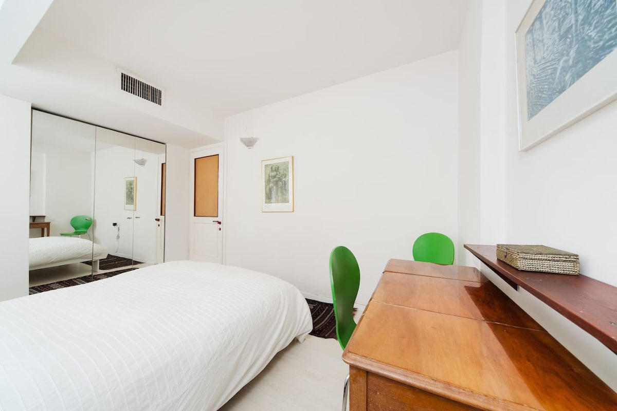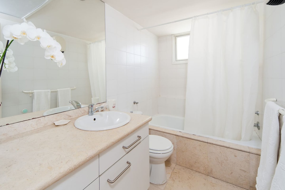 The apartment's bathroom is sleek and clean, offering a shower and all necessary amenities for a refreshing start to your day. The bedrooms are airy and serene, with plush beds and large windows that let in plenty of natural light.
