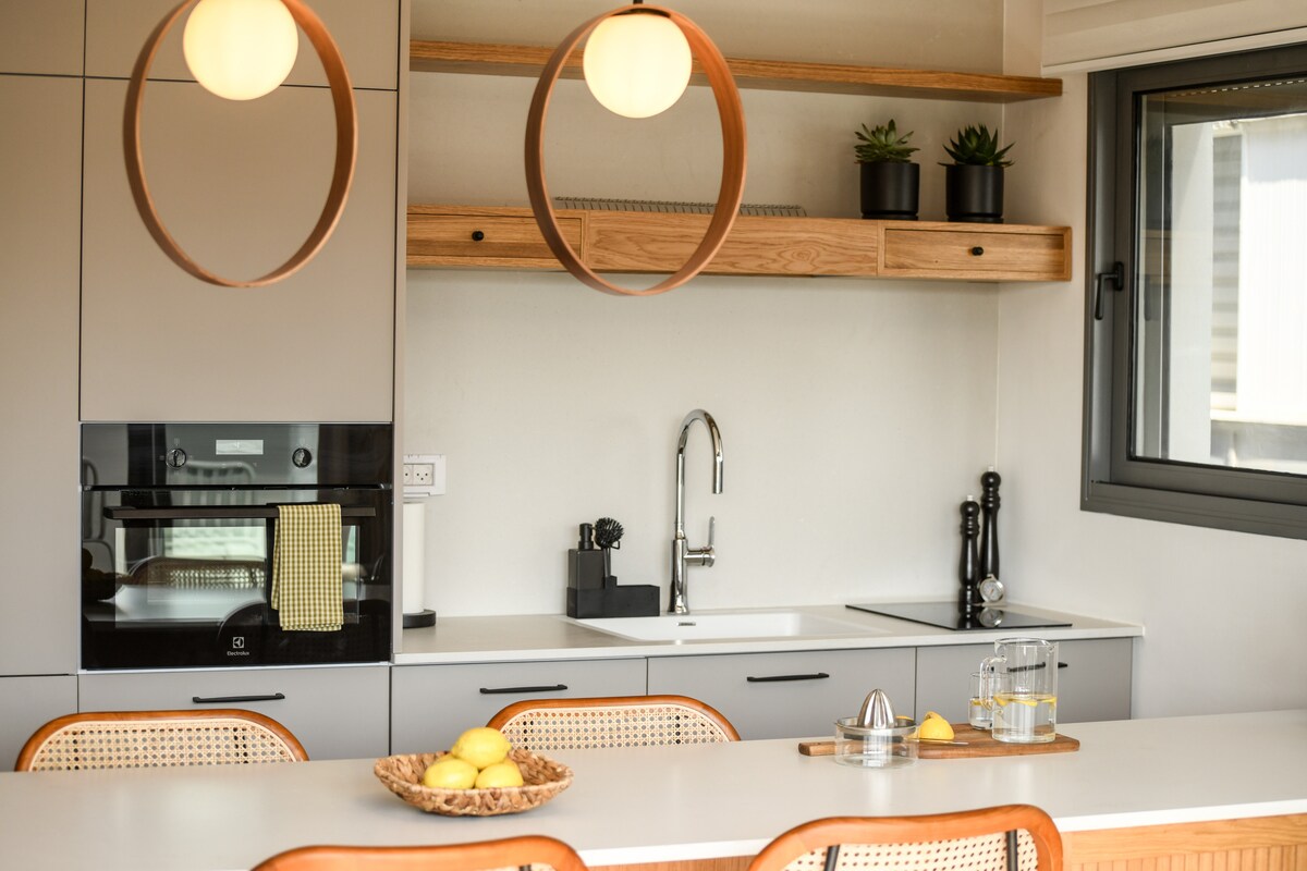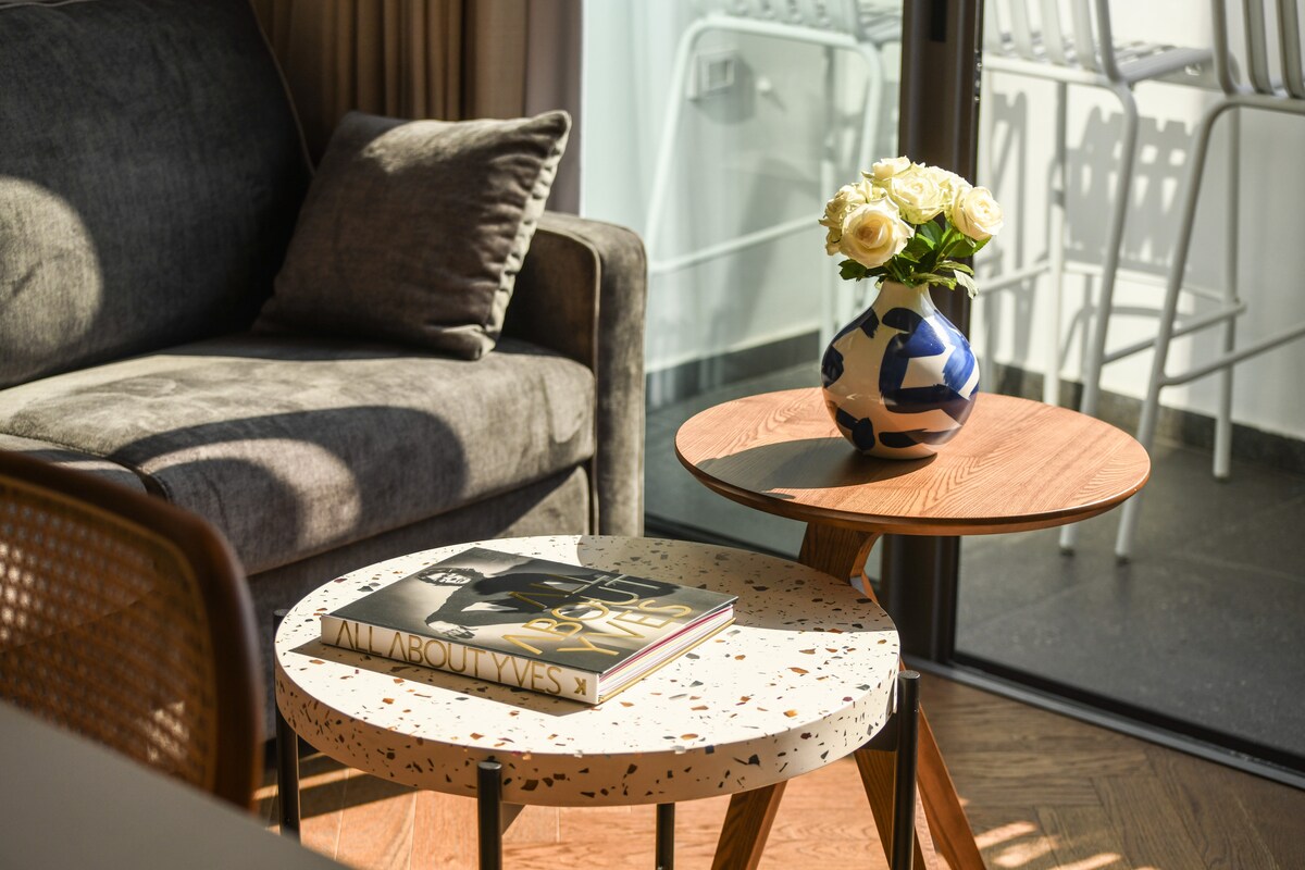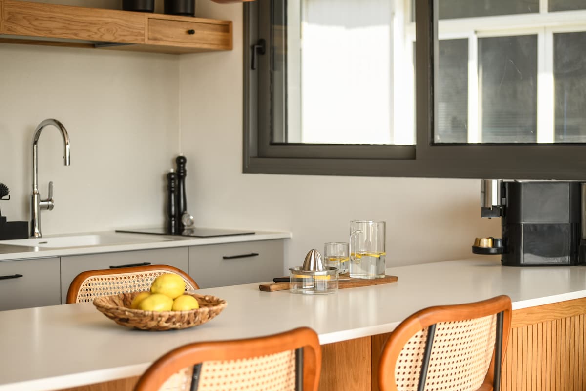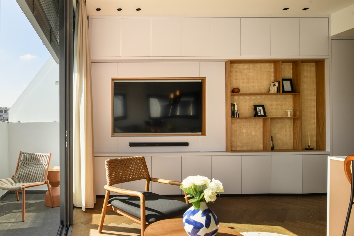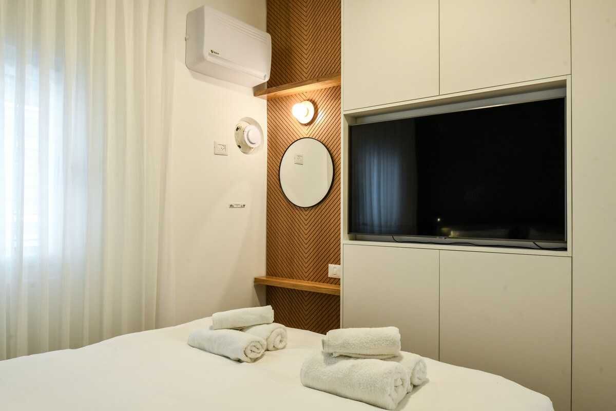 Large windows flood the apartment with natural light, offering a tranquil atmosphere where you can savor your morning coffee while feeling the calming Mediterranean breeze. If you prefer some downtime indoors, unwind in the relaxing living room, complete with a 65-inch smart TV for your entertainment.
