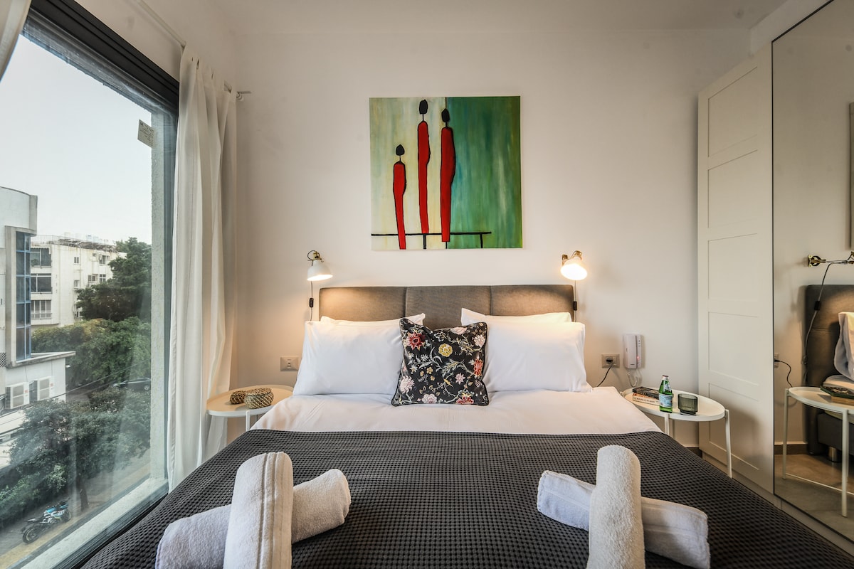 Stay connected with fast WiFi throughout the unit and enjoy the convenience of a fully equipped kitchen and a cozy living room. The apartment's big windows offer breathtaking views and overlook the large balcony, where you can relax and soak up the atmosphere.Perfectly situated only a 5 minute walk from the beach and the Port of Tel Aviv, this prime location allows you to easily explore and indulge in the city's vibrant coastal offerings.