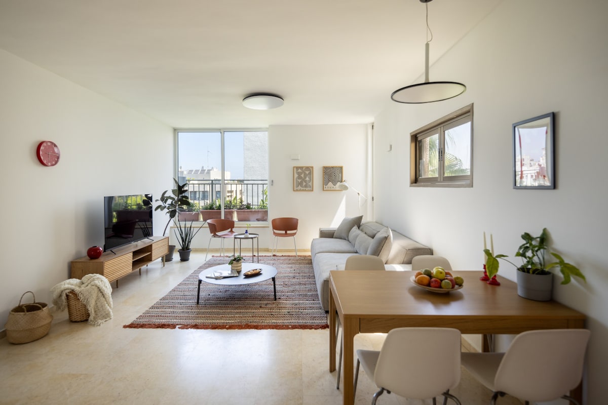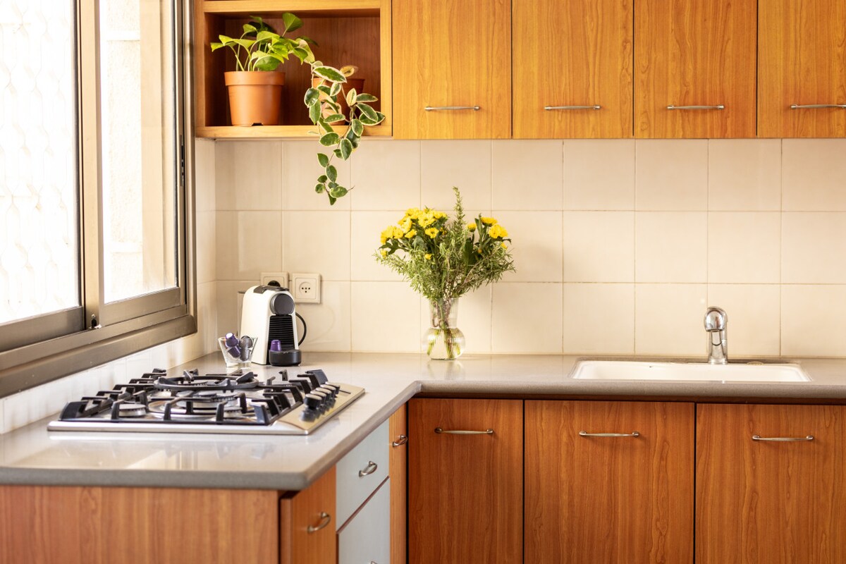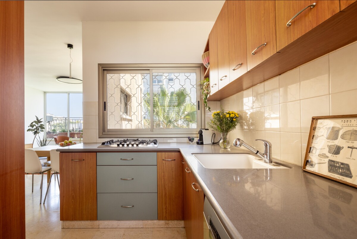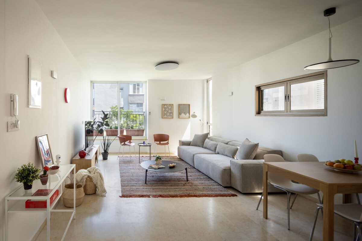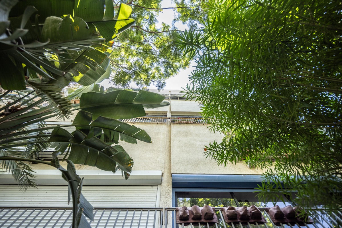 This fifth-floor apartment (with elevator access) is surrounded by lush green trees and charming small parks where you can enjoy a peaceful coffee break. Just a three-minute walk takes you to the famous Ben Gurion Street, and within 10 minutes, you can reach the vibrant Dizengoff Street. Hilton Beach is a leisurely 15-minute walk away, offering you the best of Tel Aviv's attractions within easy reach.