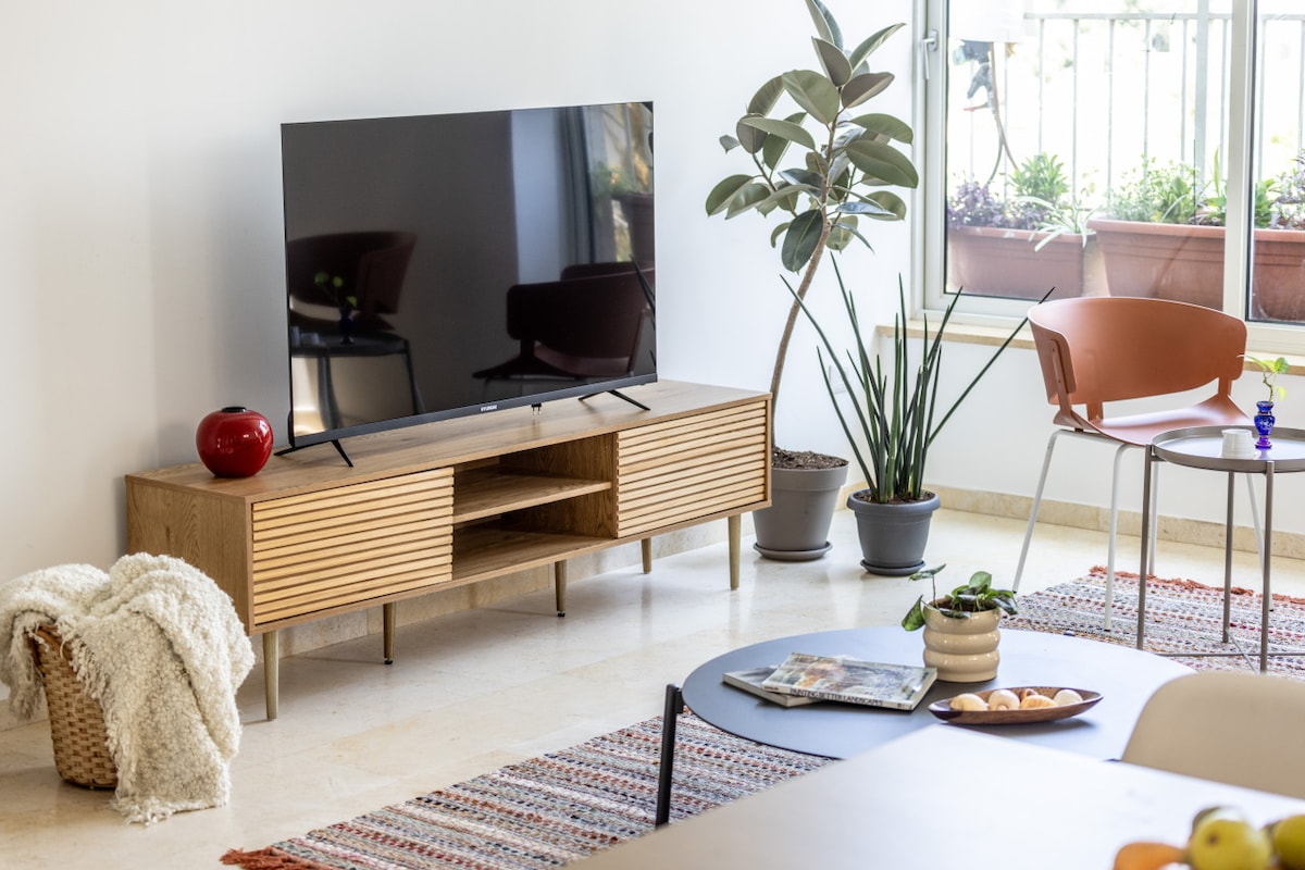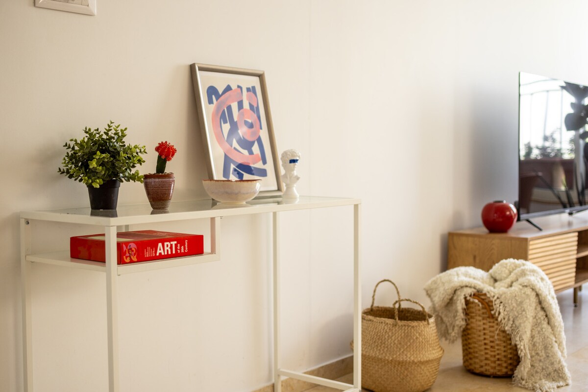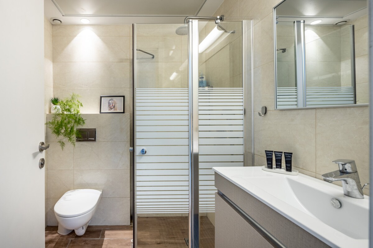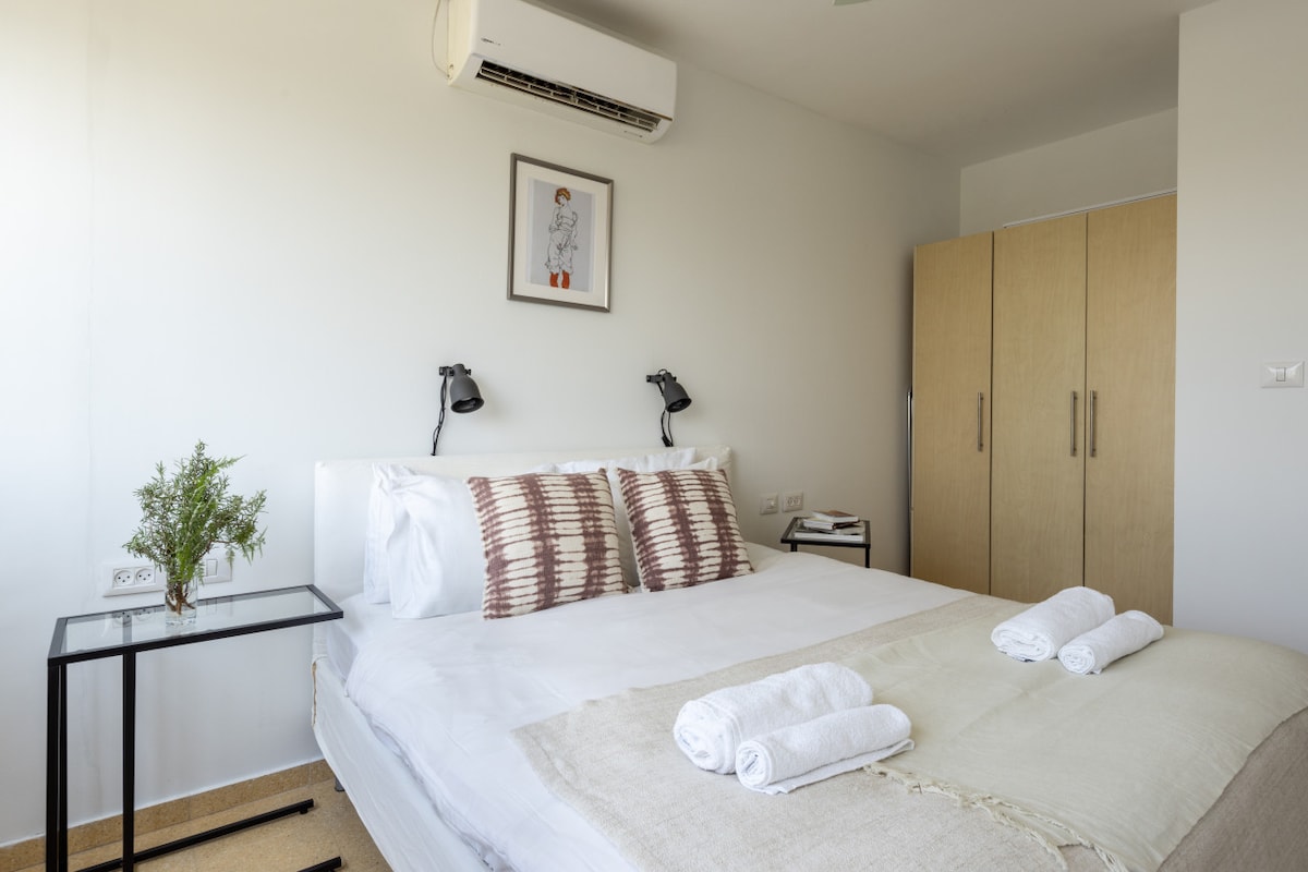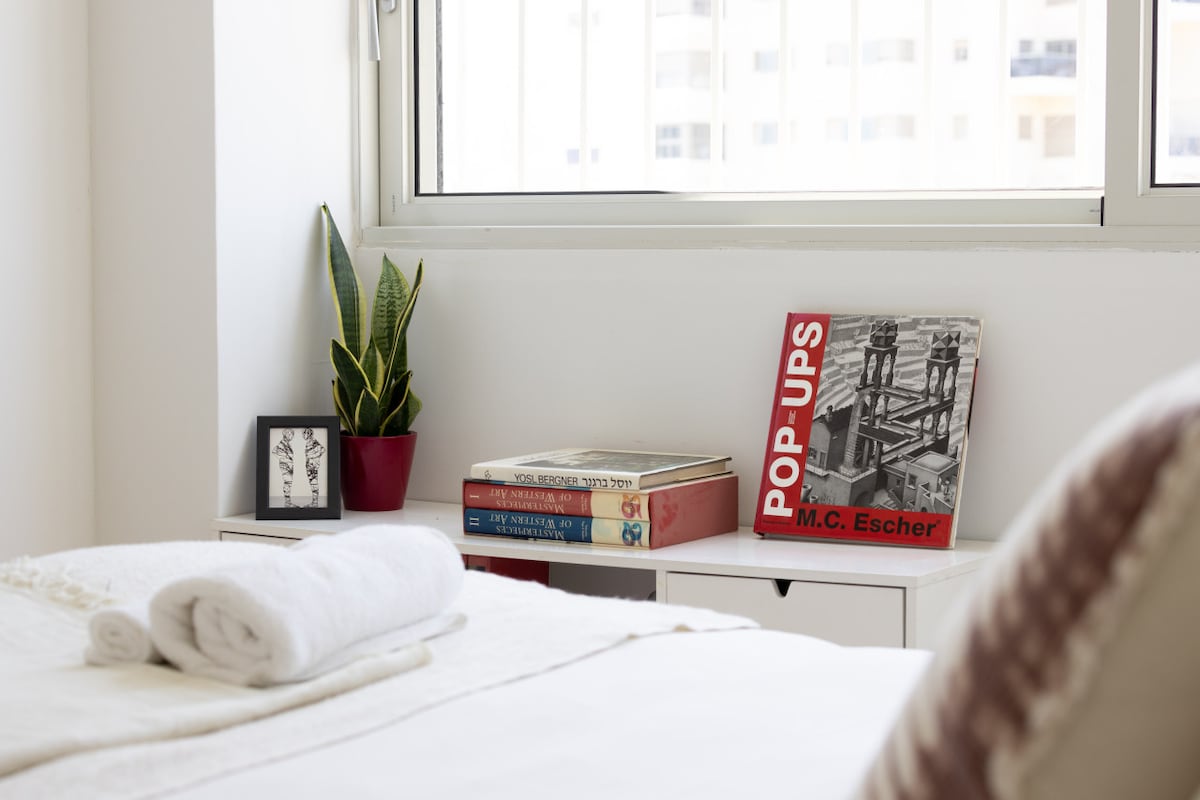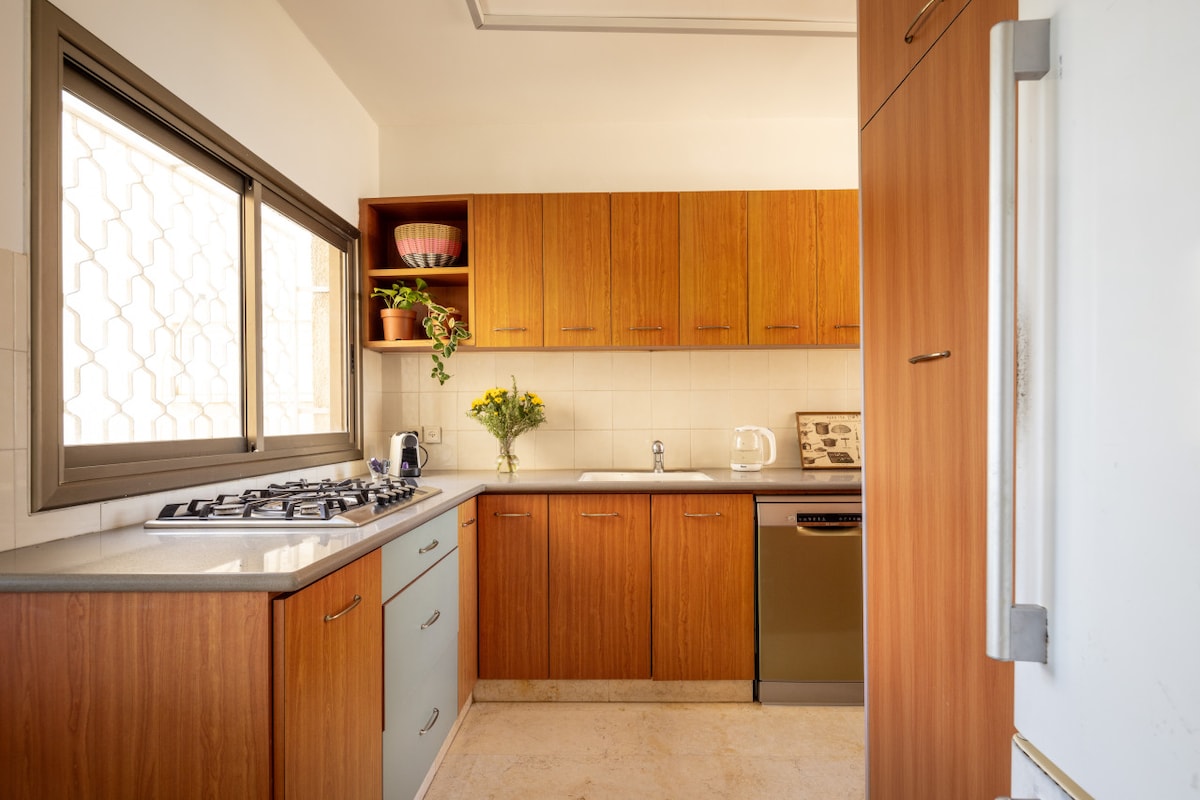 This fifth-floor apartment (with elevator access) is surrounded by lush green trees and charming small parks where you can enjoy a peaceful coffee break. Just a three-minute walk takes you to the famous Ben Gurion Street, and within 10 minutes, you can reach the vibrant Dizengoff Street. Hilton Beach is a leisurely 15-minute walk away, offering you the best of Tel Aviv's attractions within easy reach.