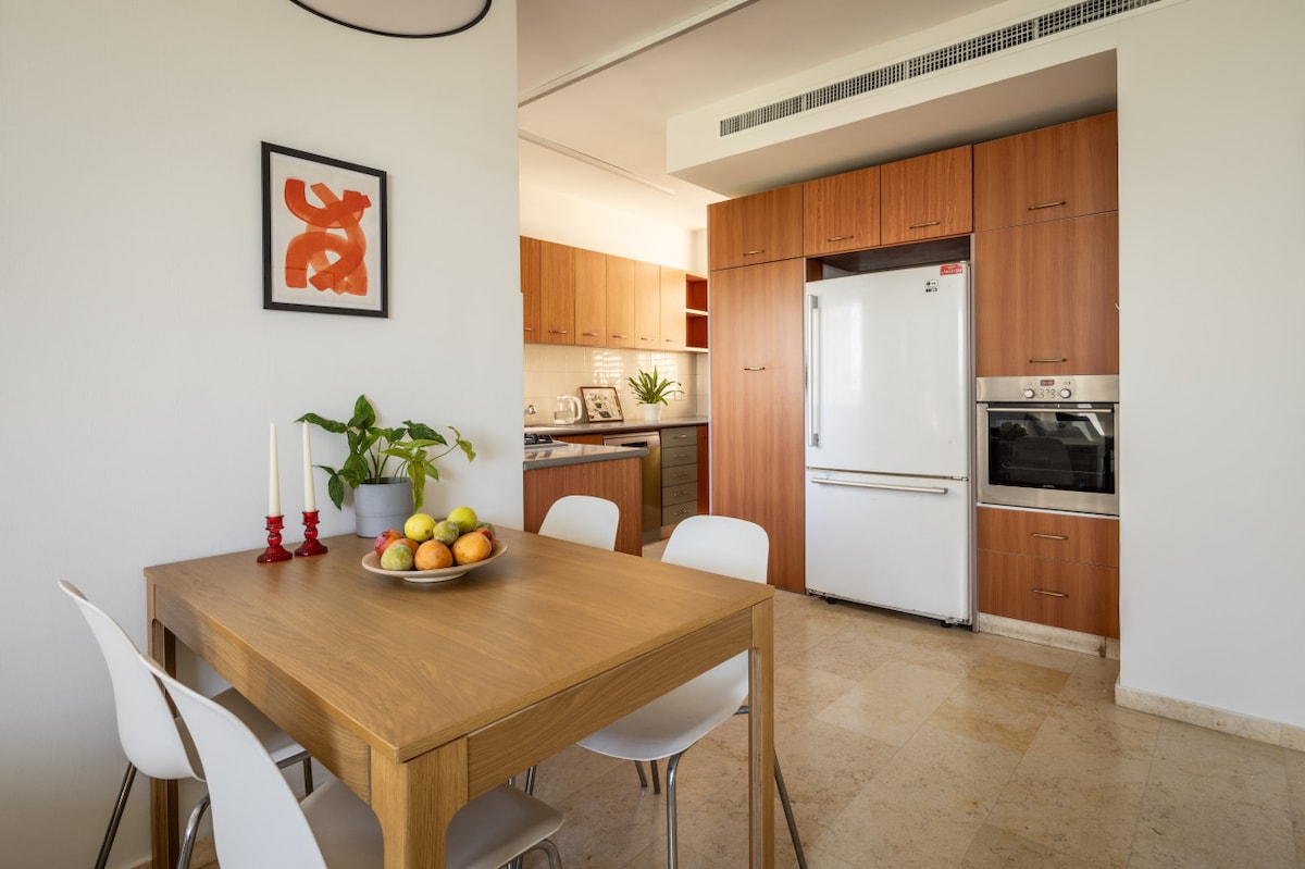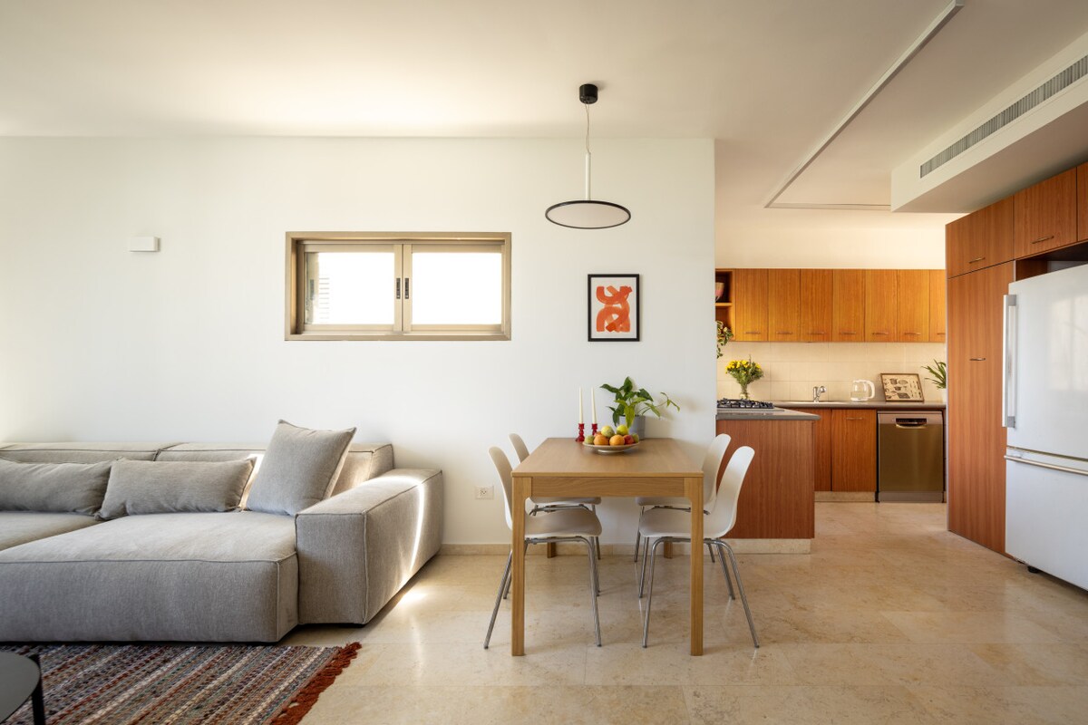 The spacious open layout seamlessly connects the kitchen and living room, making it ideal for cooking and dining together. The living room exudes warmth and comfort, perfect for relaxing after a day of exploring the city.This fifth-floor apartment (with elevator access) is surrounded by lush green trees and charming small parks where you can enjoy a peaceful coffee break. Just a three-minute walk takes you to the famous Ben Gurion Street, and within 10 minutes, you can reach the vibrant Dizengoff Street. Hilton Beach is a leisurely 15-minute walk away, offering you the best of Tel Aviv's attractions within easy reach.