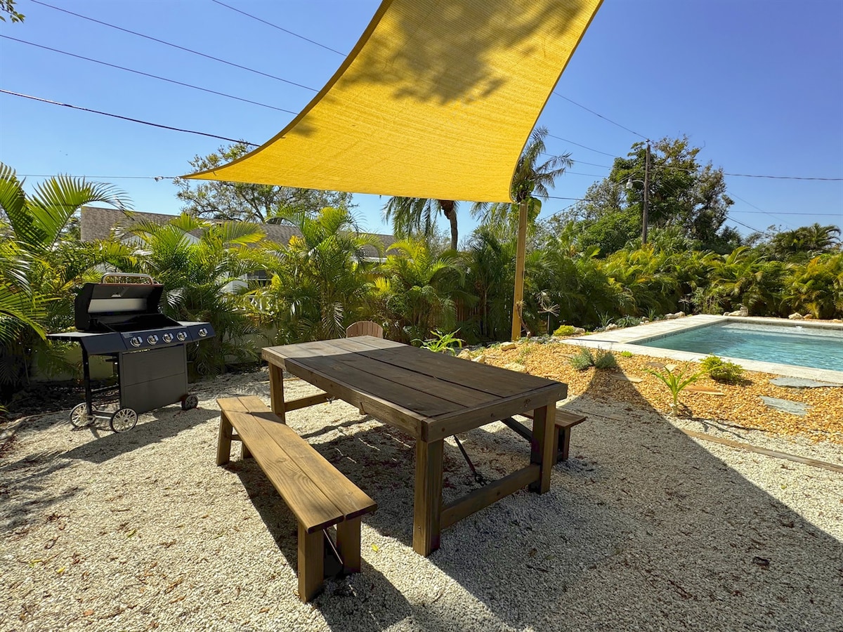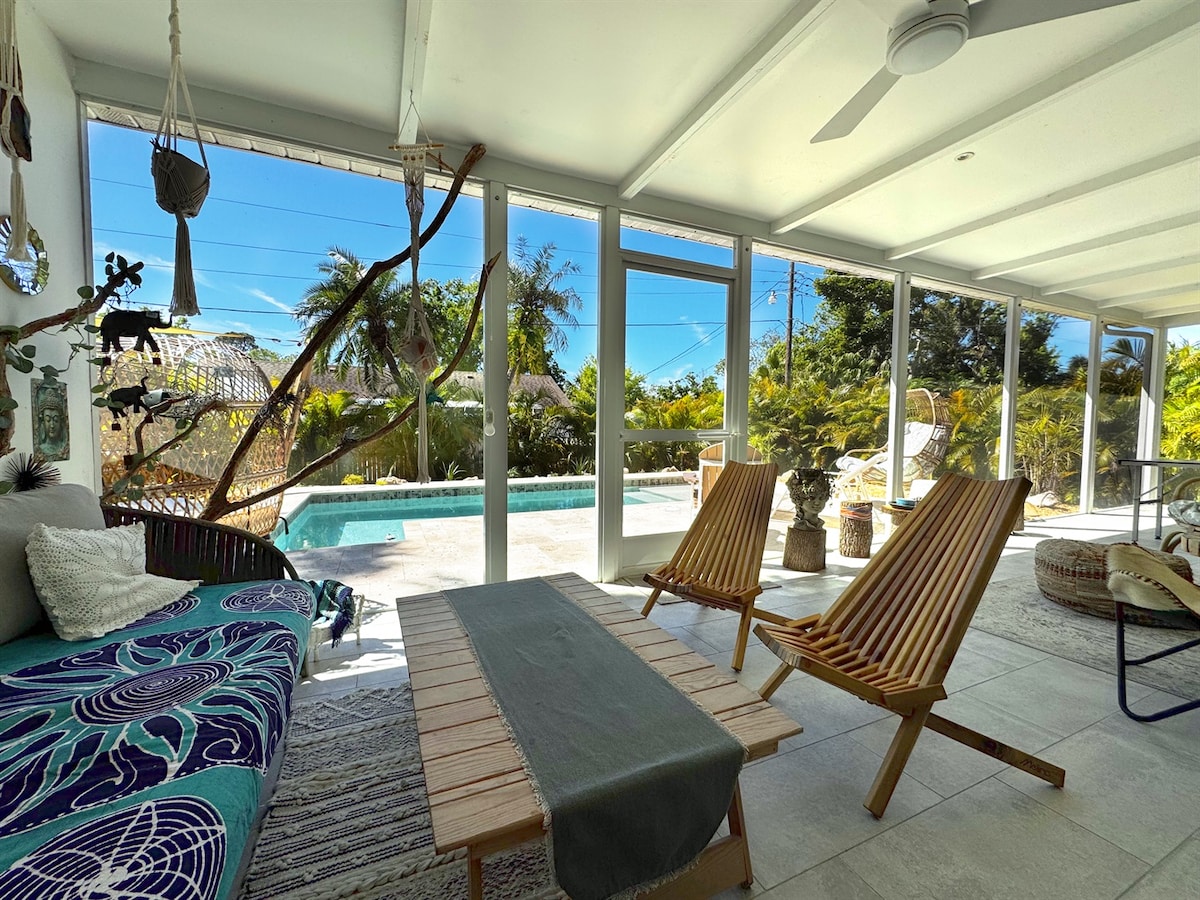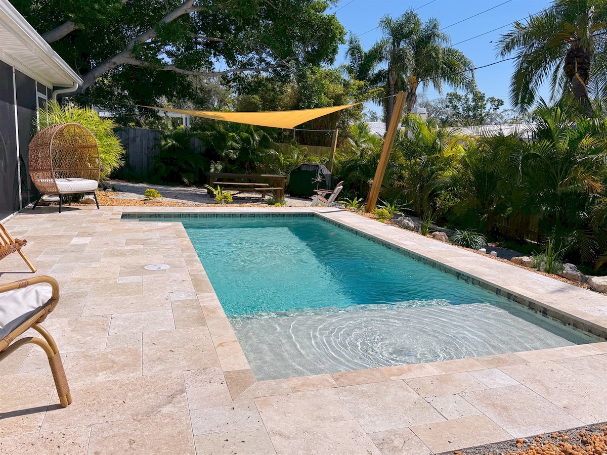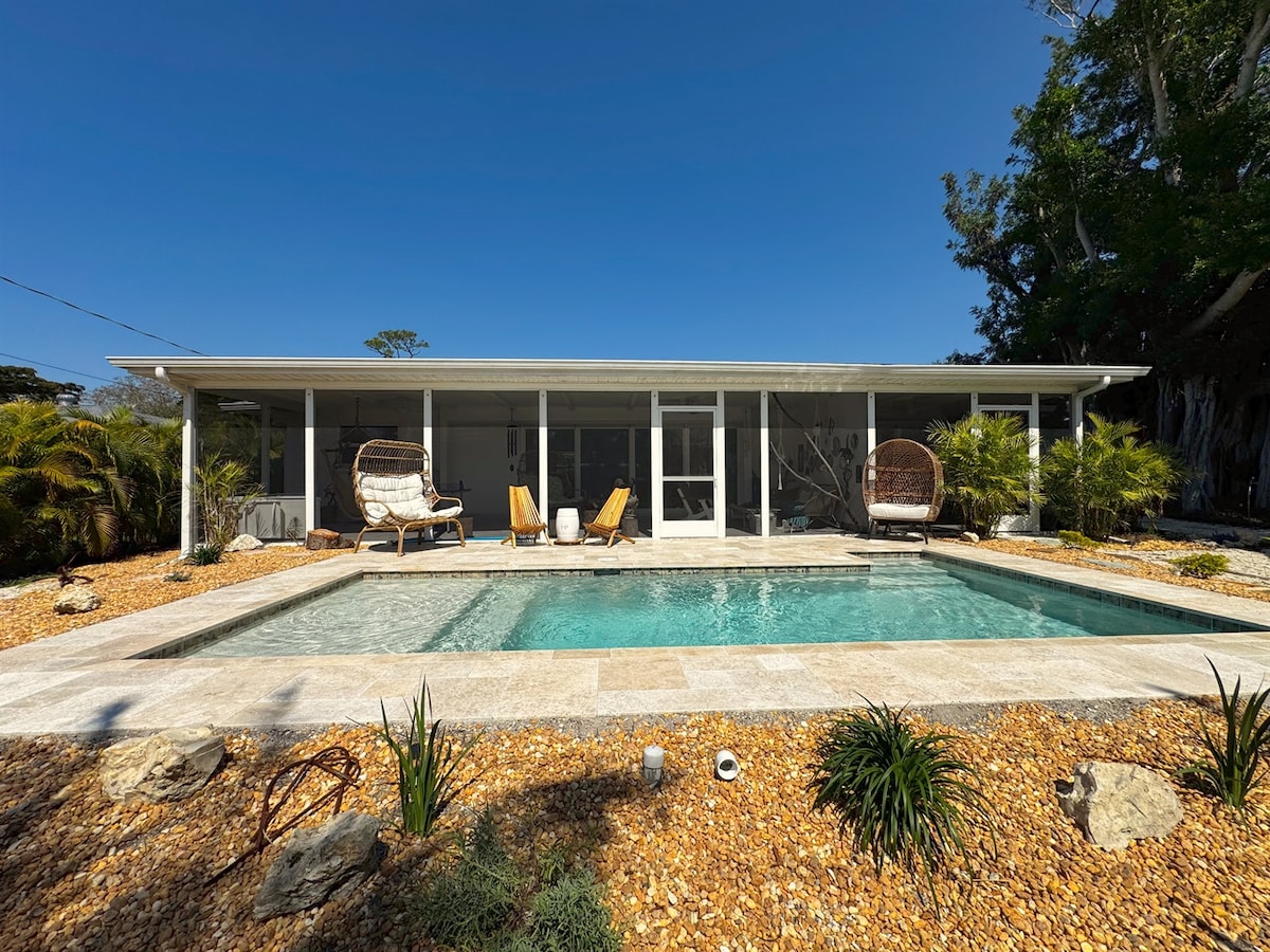 Serenity Retreat is a well-located 3-bedroom, 2-bath vacation home in Sarasota with a private pool that can be heated, situated in the desirable Indian Beach / Sapphire Shores neighborhood.