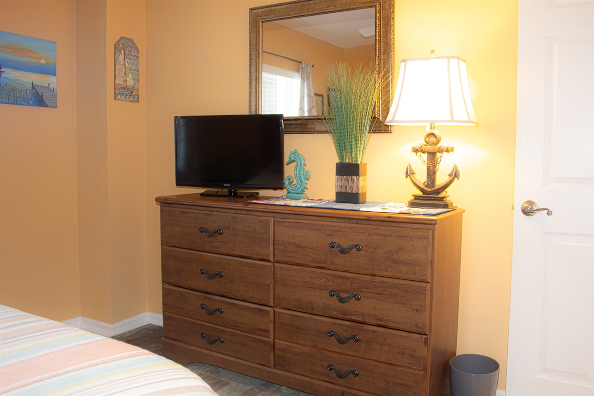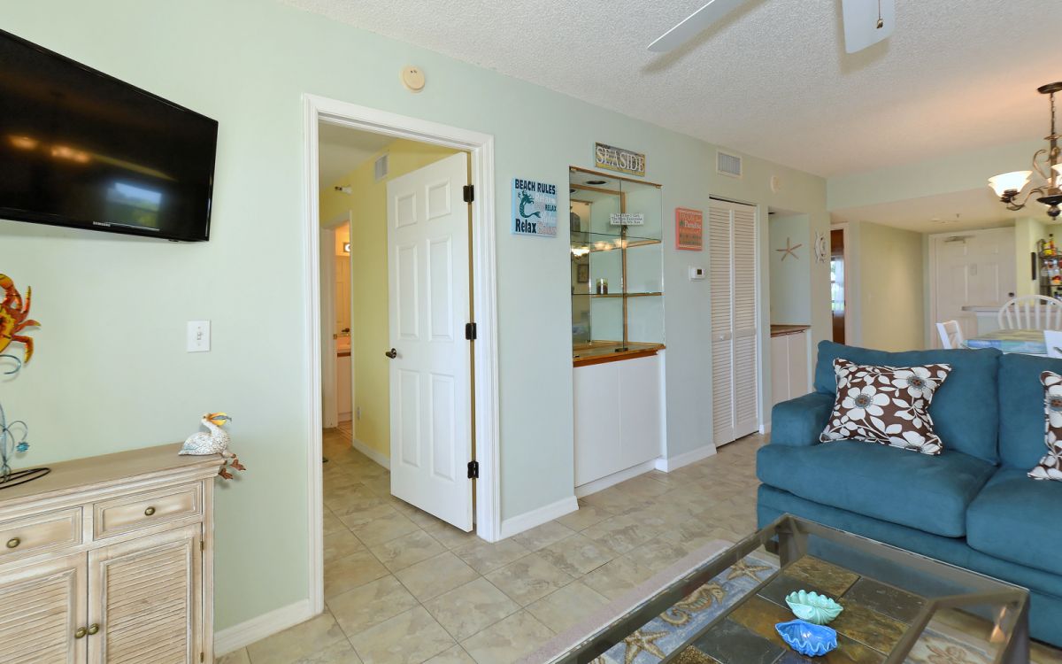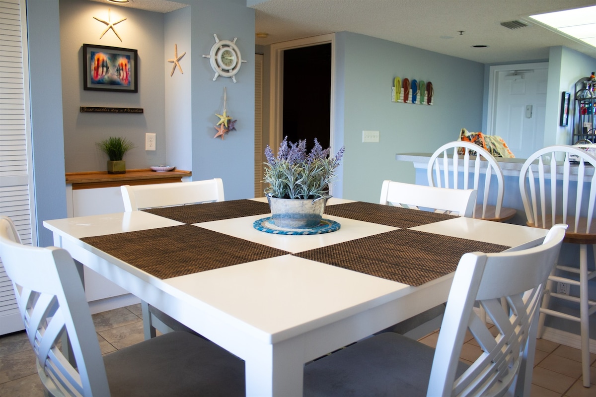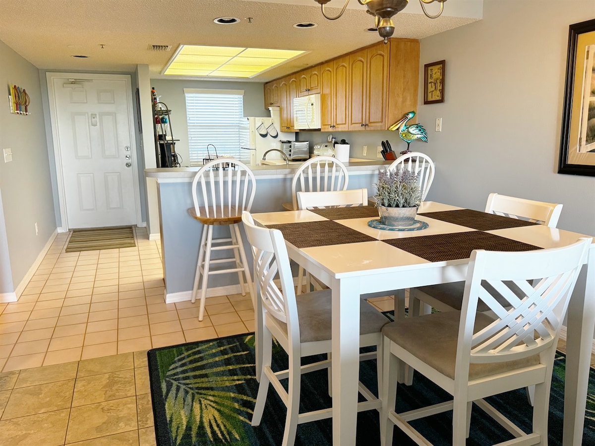 Point of View offers a bright and open interior designed for comfort and relaxation. The living and dining area is filled with natural light and opens directly to the screened-in balcony, allowing guests to fully enjoy the stunning bay and golf course views.The kitchen is fully equipped with essential appliances and a breakfast bar, making meal preparation easy and enjoyable. Both bedrooms are comfortably furnished with quality bedding and ample storage. Two full bathrooms provide convenience for daily routines.