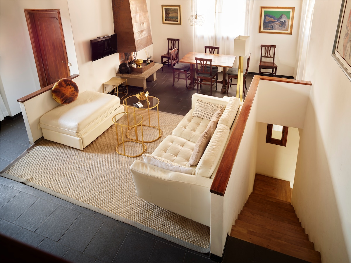 Characteristic bright apartment in a perfect location. The real wonder are the views of the rooftops from which you can see the Duomo, the bell tower of Santo Spirito and parts of Florence's historic center.The apartment is mainly on two levels: you enter and find the kitchen, on the upper level the large living area with sofa and pouf that can be transformed into a single bed, dining table and bathroom, with bedroom in a separate but not enclosed area. The space is very articulated by changes of level and sloping ceiling, with three windows with different and surprising views