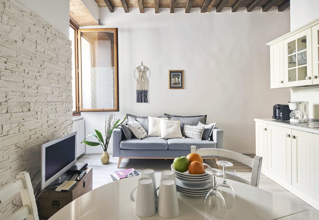 The furniture is a completely renovated state with a skilful mix of modern furniture in bohemian style, which fits well with the characteristics of the Florentine house. The kitchen is small but well organized. The rooms are complete with wardrobes.