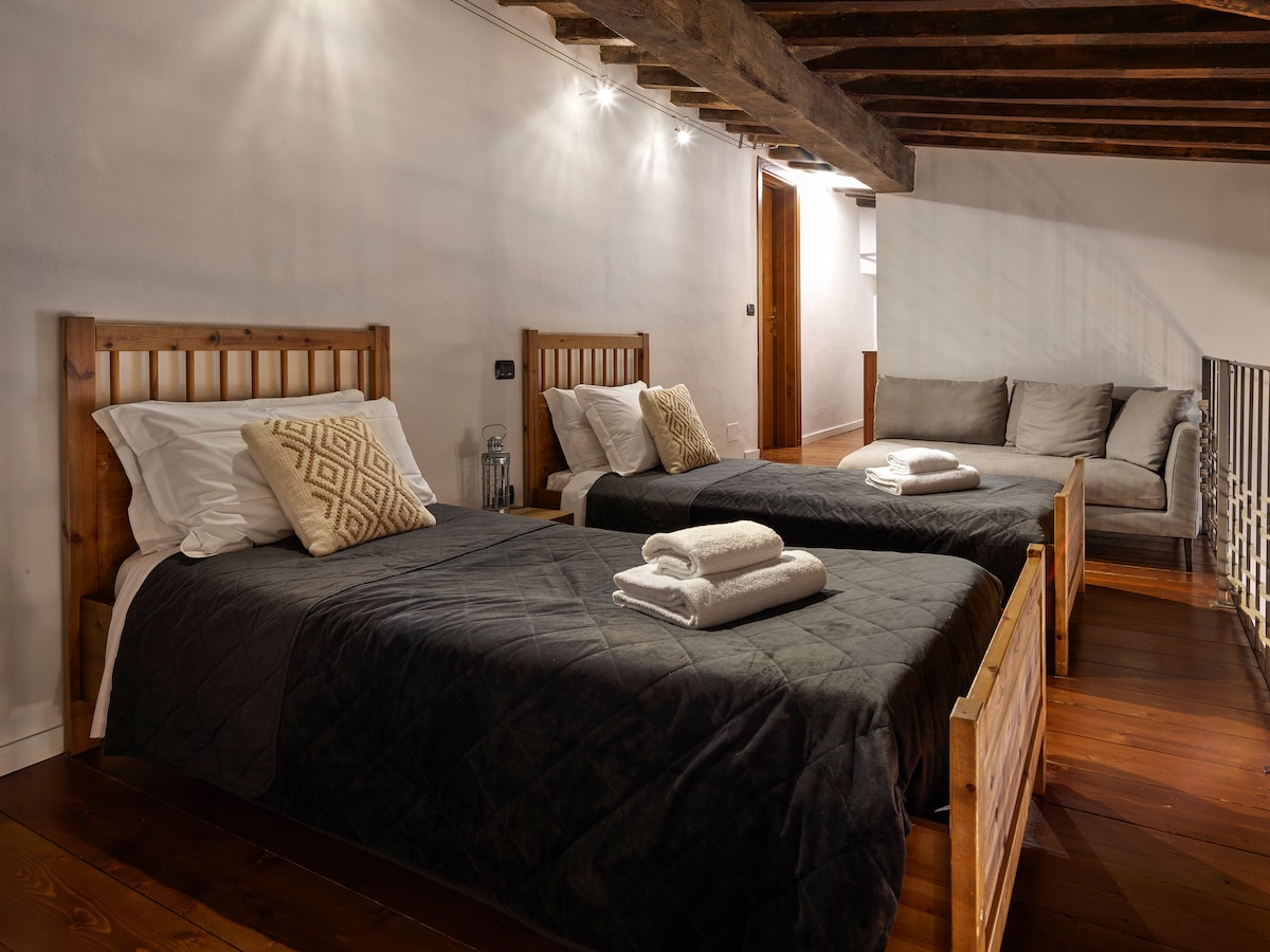 It has three double bedrooms, one with a beautiful view of San Lorenzo and a small terrace on the rooftops, and a room with two single beds on the mezzanine in the living area, and three bathrooms, to comfortably accommodate 8 people. Perfect for groups or large families, it's also very quiet.This apartment is literally a stone's throw from the Duomo, less than an 8-minute walk from the station. Perfect location to visit the city. The building is located on a characteristic pedestrian street, with fashion shops, restaurants and bars with outdoor tables, always very lively but without car traffic.