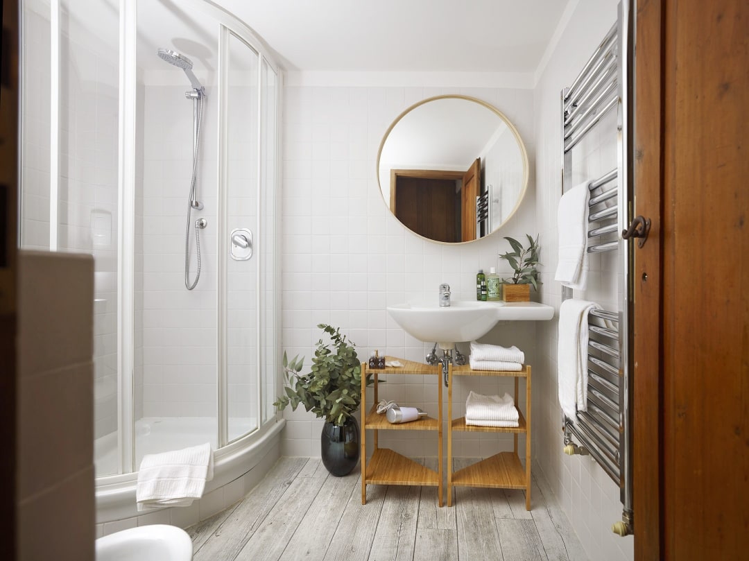 Bathroom with shower; heated towel rails, mirror lights, hairdryer.