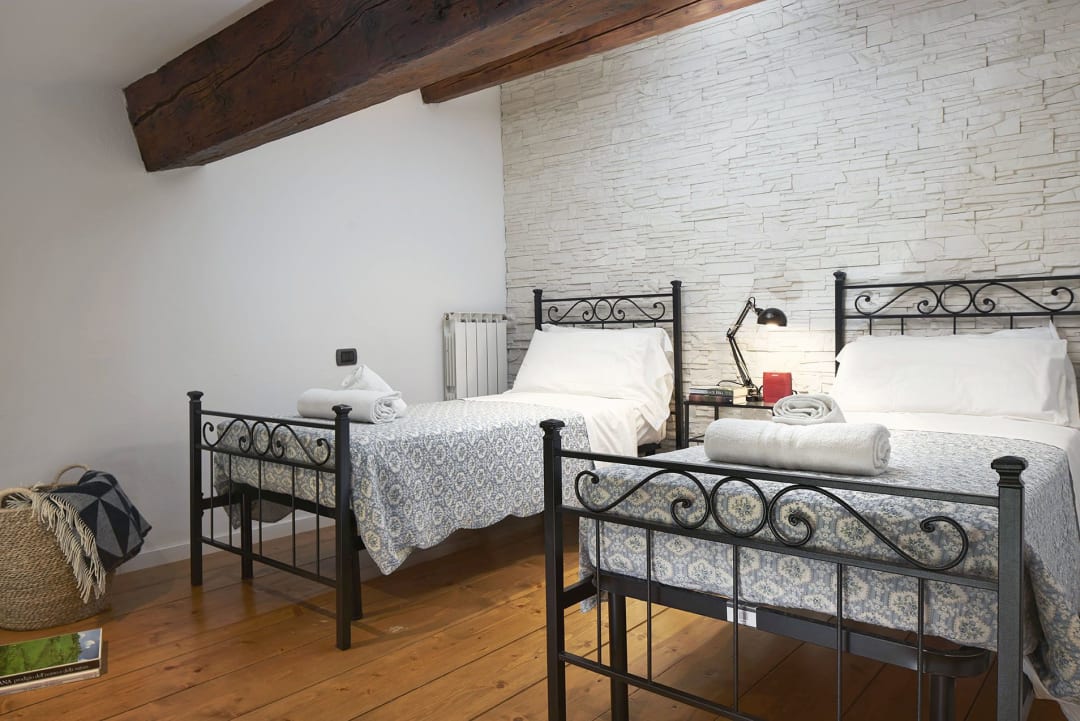 four gas burners; sink; dishwasher; Nespresso coffee machine; Italian coffee machine (moka); kettle; toaster; microwave; large refrigerator with freezer; essentials (salt, sugar, coffee, tea, oil, vinegar), goblet and water glasses, plates, cutlery and cooking tools; pots and pans. Washing machine.Double bedroom in the loft with 160x200 cm bed; mezzanine bedroom with two single beds; two wardrobes are located on the main level.