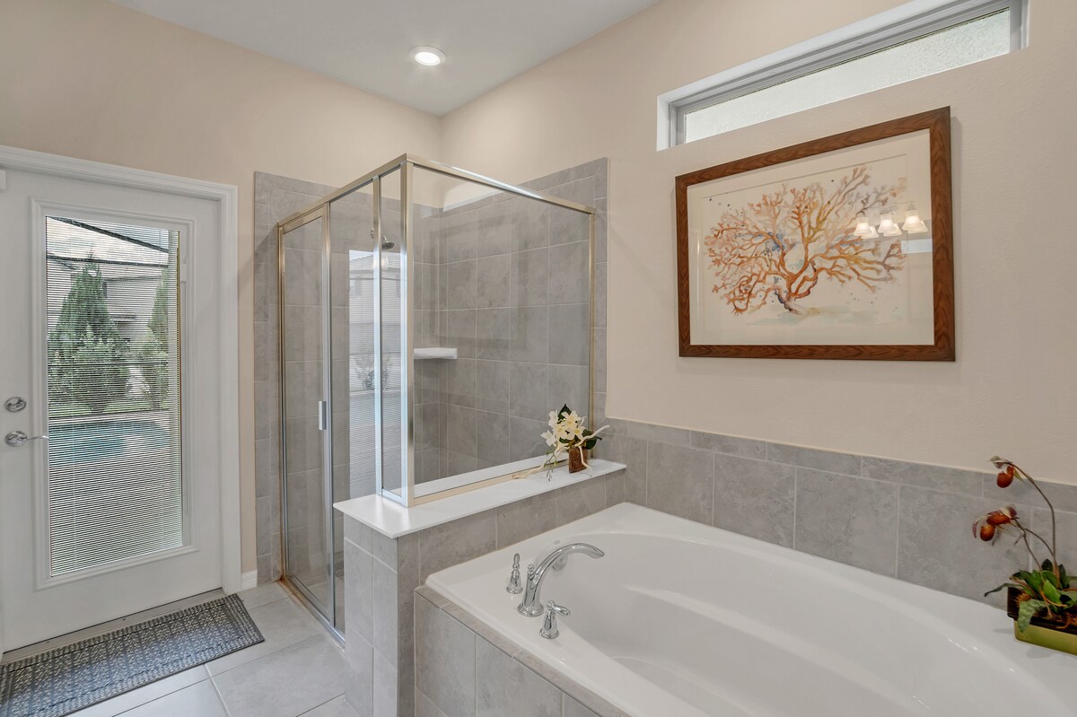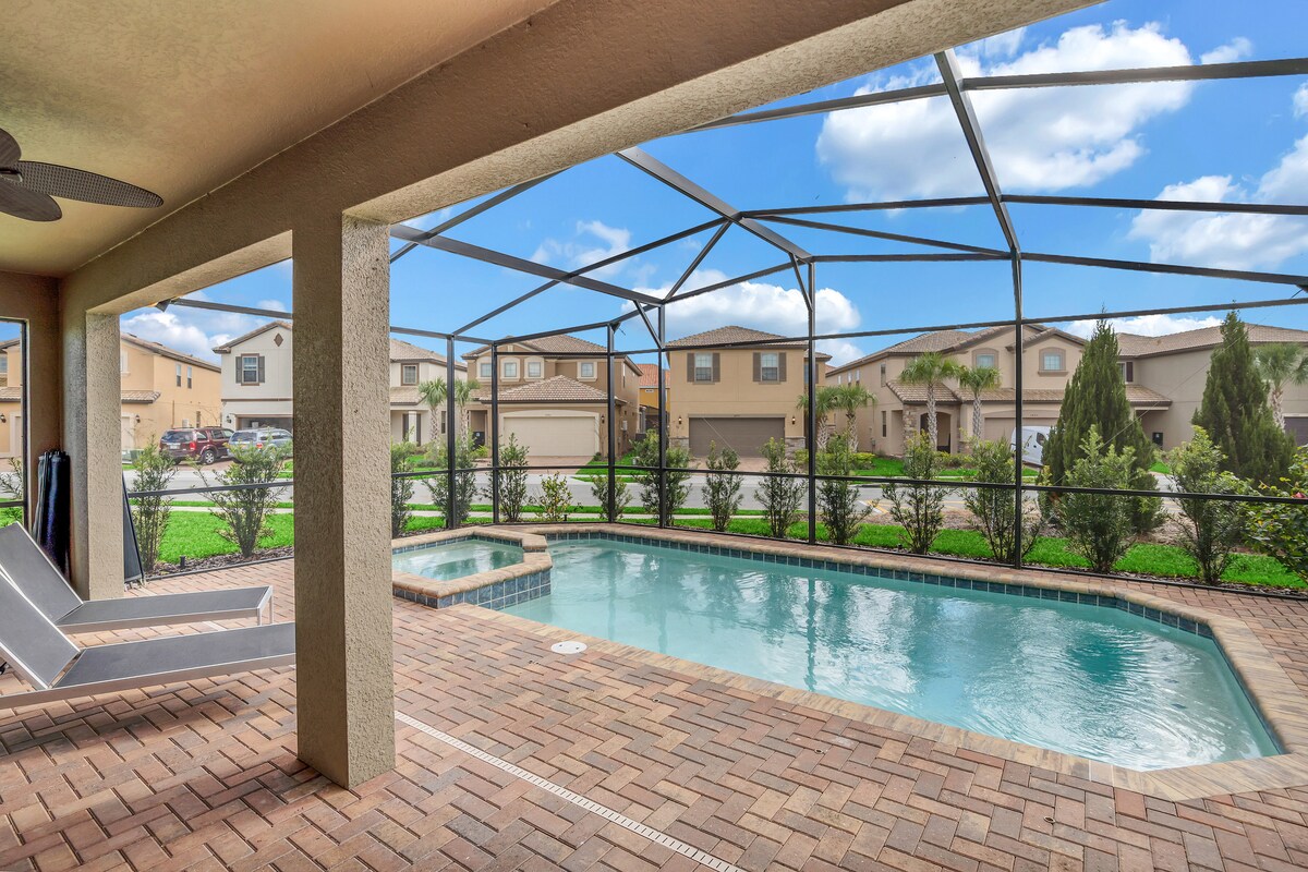 The outdoor area features a private pool and spa, perfect for soaking up the Florida sunshine. The patio includes outdoor dining furniture, making it easy to enjoy meals together in the fresh air.