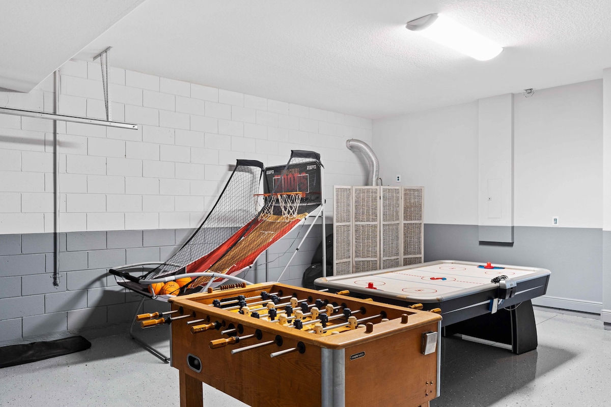 The home features a vibrant children’s playroom stocked with toys, books, and games, along with a game room equipped with foosball and a hockey table. These entertainment spaces are perfect for keeping everyone engaged and creating cherished memories.