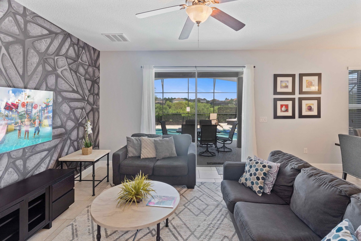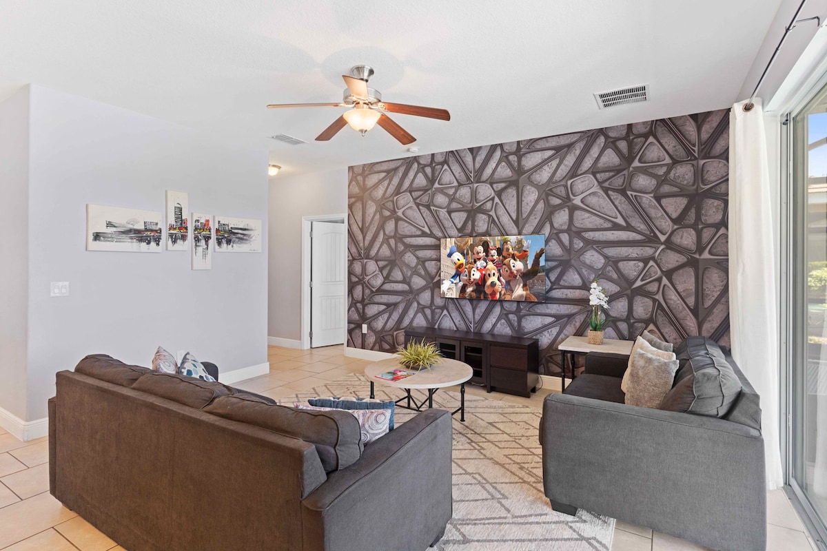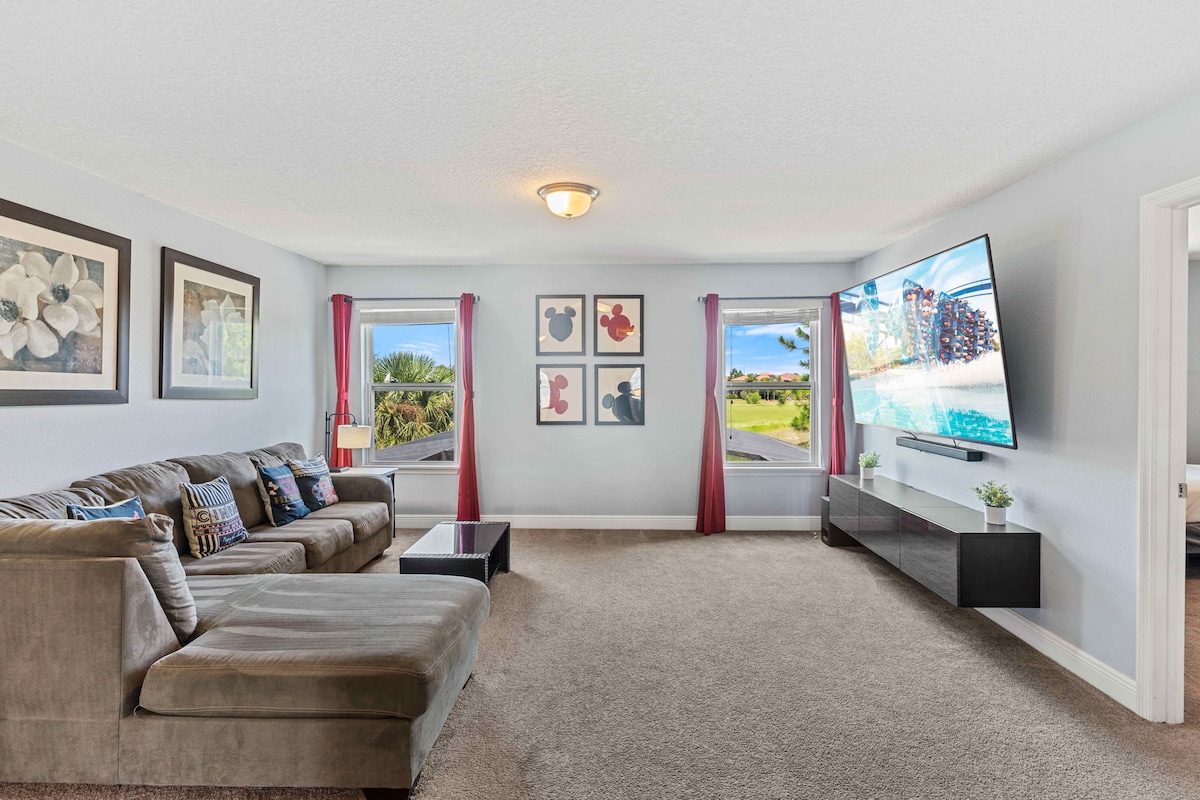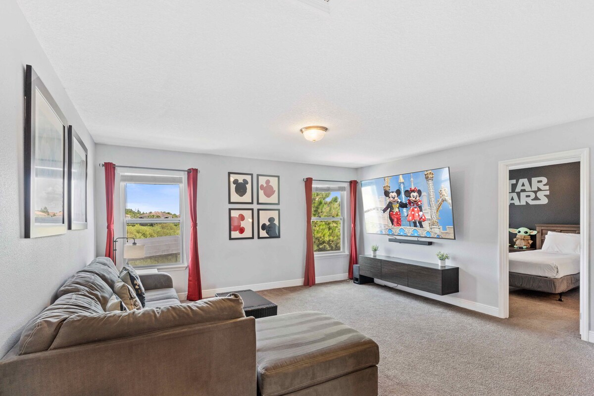 Relax in the cozy and inviting living area, featuring comfortable seating and a large-screen smart TV. The open layout ensures plenty of space for everyone to gather, watch movies, or enjoy conversations, making it the perfect spot to unwind after a busy day of fun.