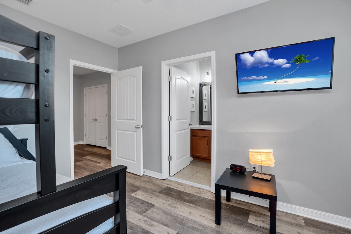 The Mickey-themed bedroom is a dream come true for children, featuring a fun bunk bed and playful Disney decor. This vibrant space adds an extra touch of magic to their vacation, creating unforgettable memories.