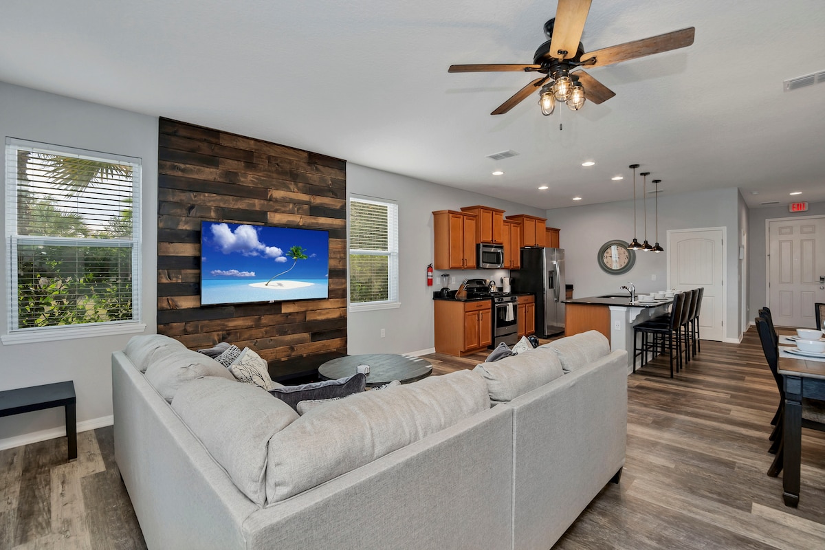 The heart of this home is its open-concept living area, designed to bring everyone together. Relax on comfortable seating in the living room and stream your favorite shows on the large TV. This space flows into the dining and kitchen areas, making it ideal for socializing, relaxing, or planning the next day’s adventures.