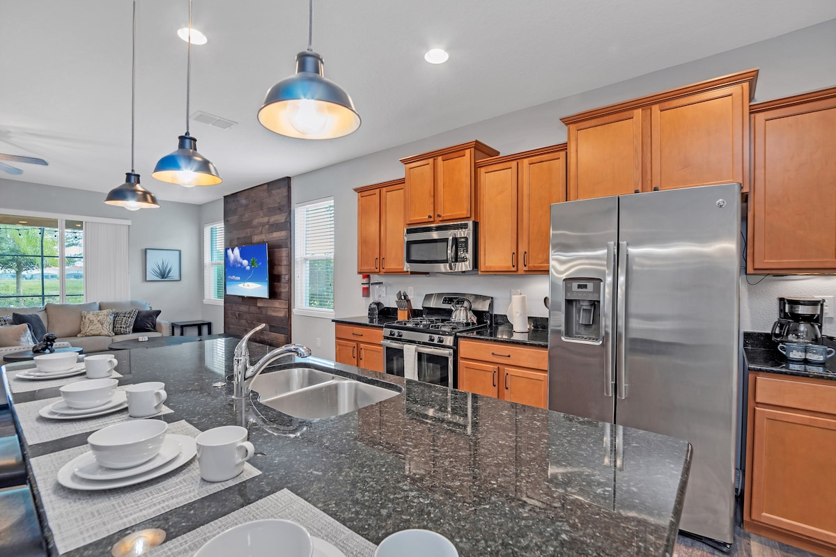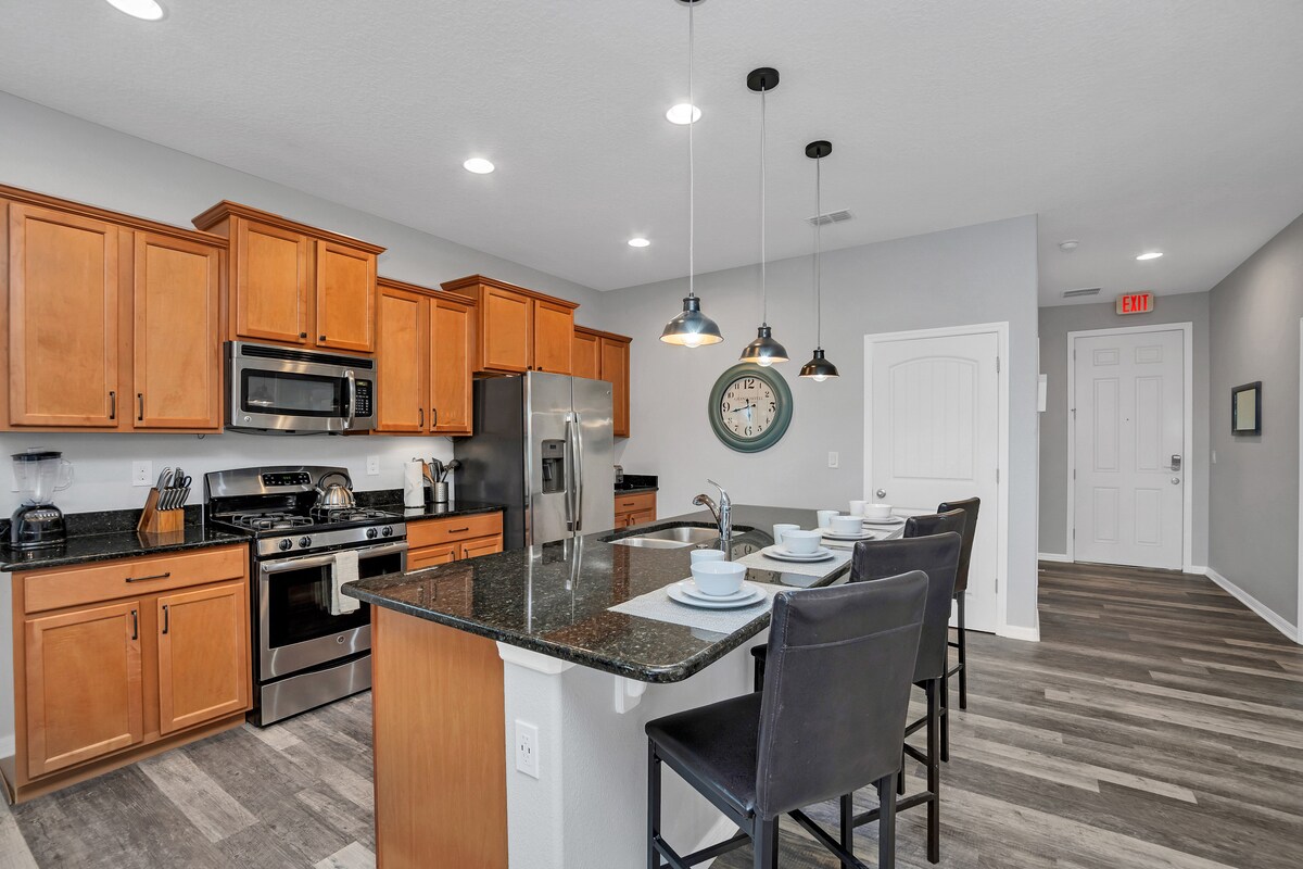 Cook with ease in the fully equipped kitchen, featuring stainless steel appliances, granite countertops, and all the essentials, including pots, pans, oil, and spices. The kitchen island provides additional seating, perfect for quick breakfasts or evening snacks. Whether you’re preparing homemade meals or reheating leftovers, this kitchen has everything you need.